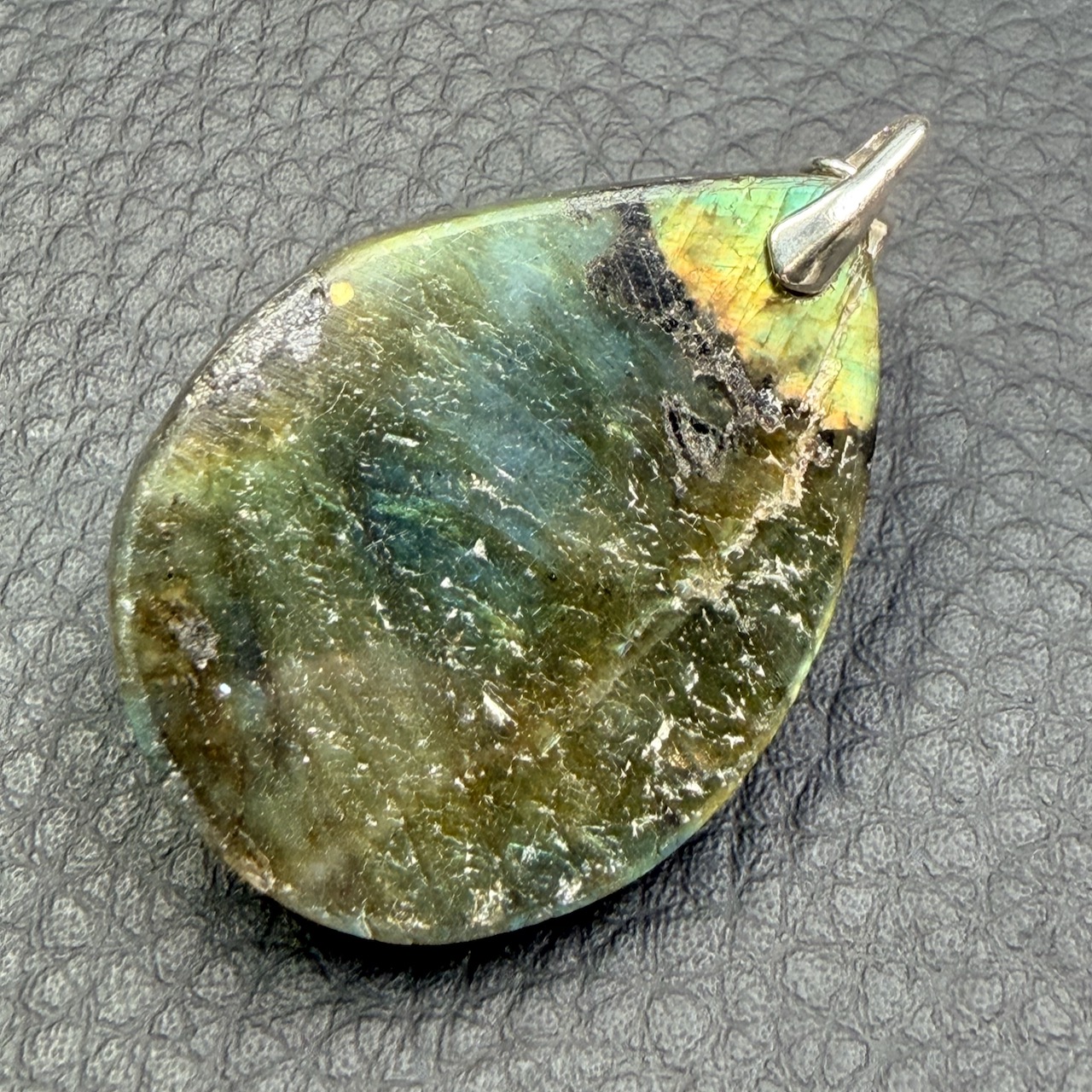 Taille du Pendentif en Labradorite Verte hors bélière 3,5 cm sur 2,7 cm sur 0,7 cm.