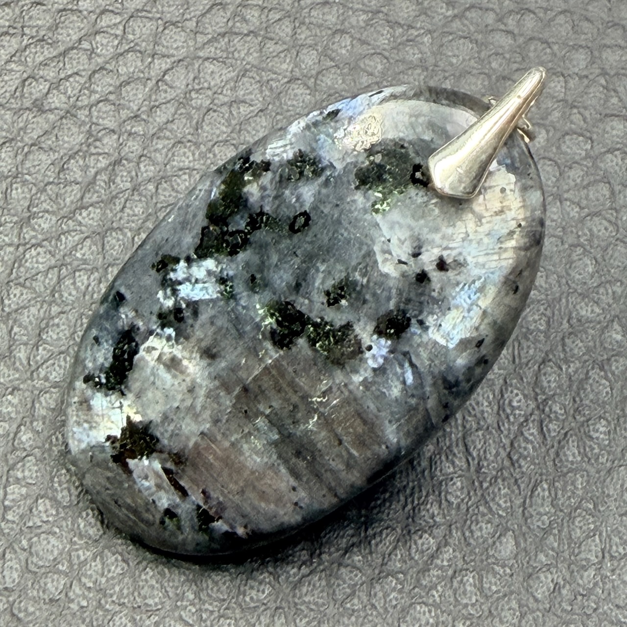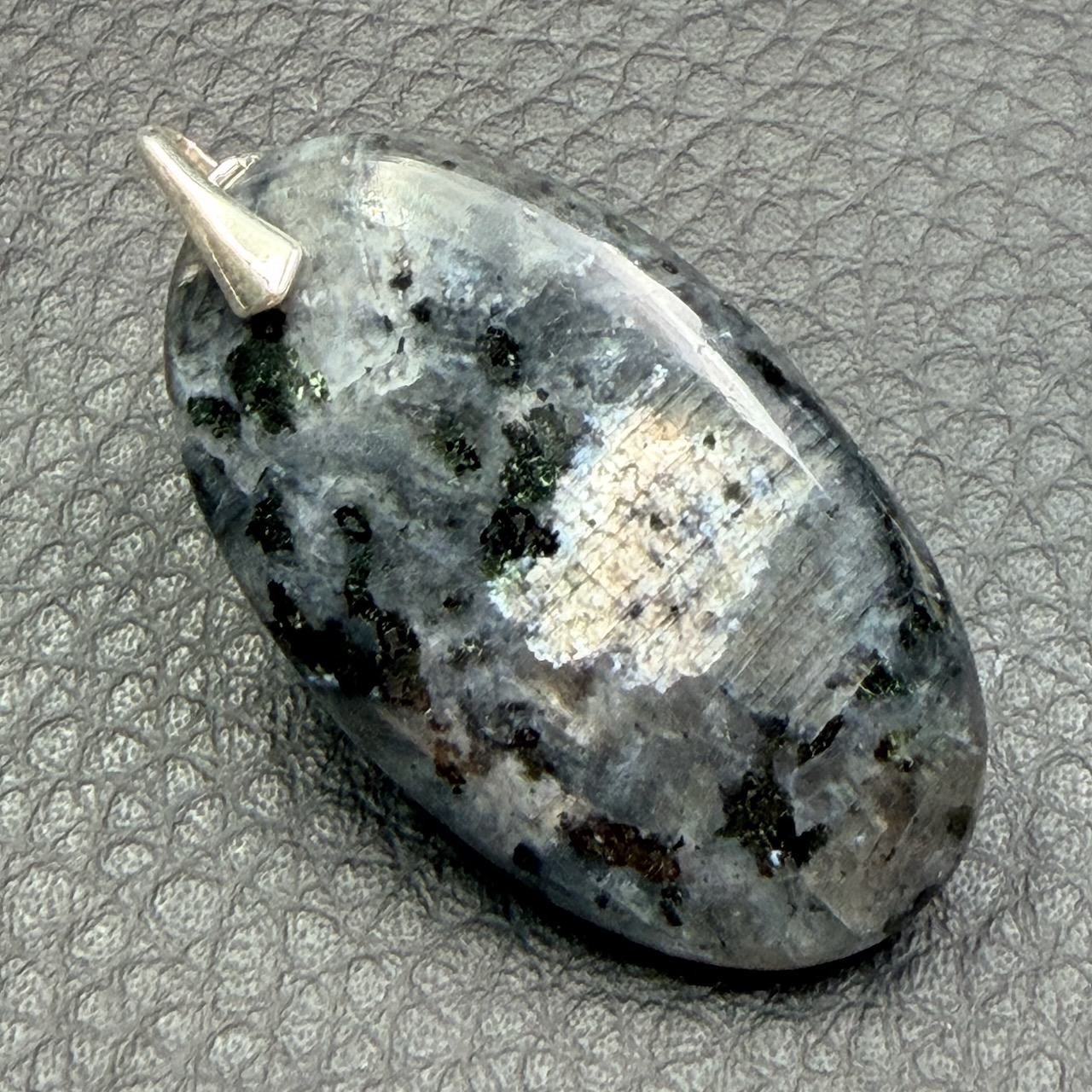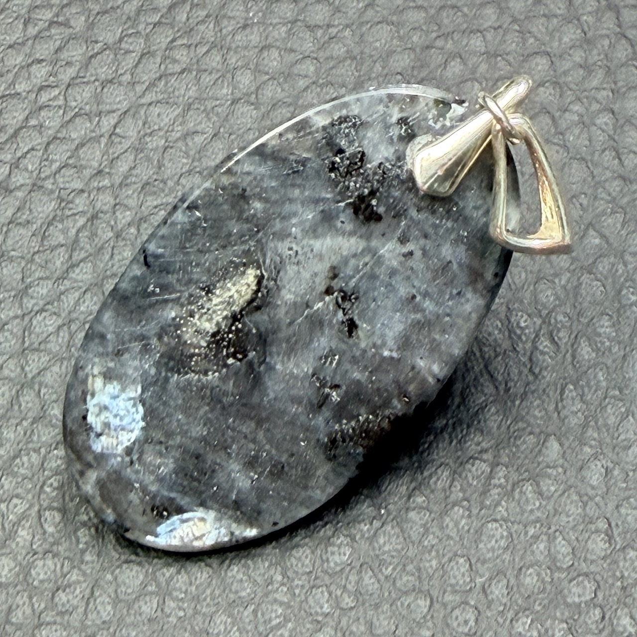 Taille du Pendentif en Larvikite hors bélière 3,6 cm sur 2,1 cm sur 0,5 cm.