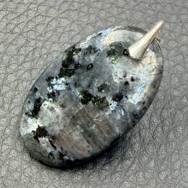 Le Pendentif en Larvikite, avec ses teintes de gris, noirs et argentées, se marie bien avec d’autres pierres naturelles.