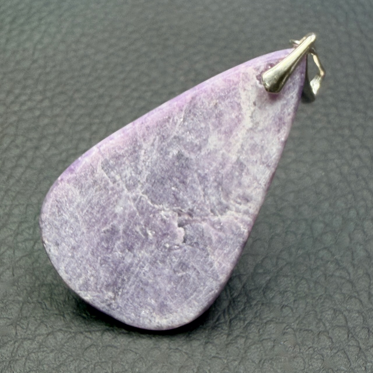 Taille du Pendentif en lépidolite hors bélière 4,7 cm sur 2,8 cm sur 0,7 cm.