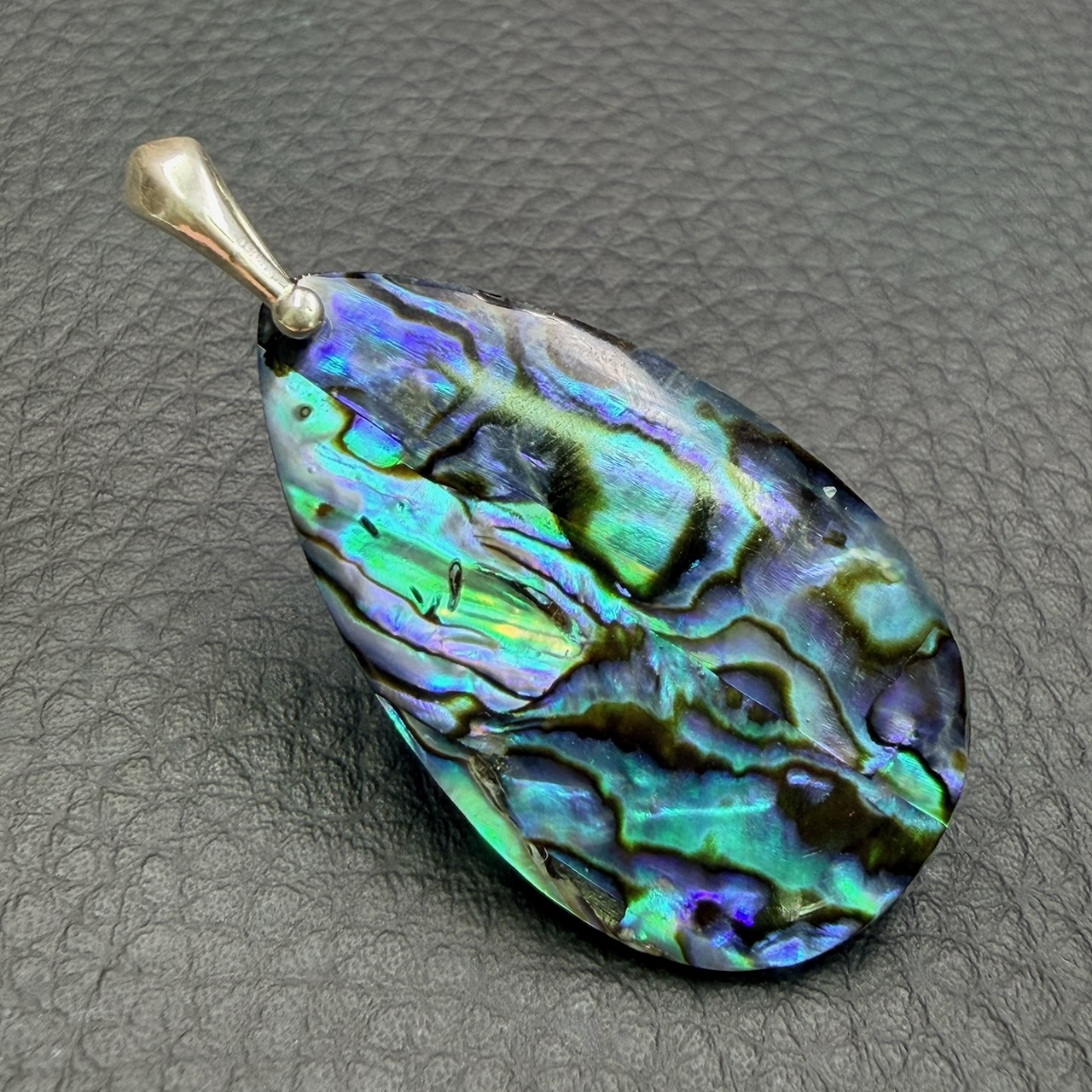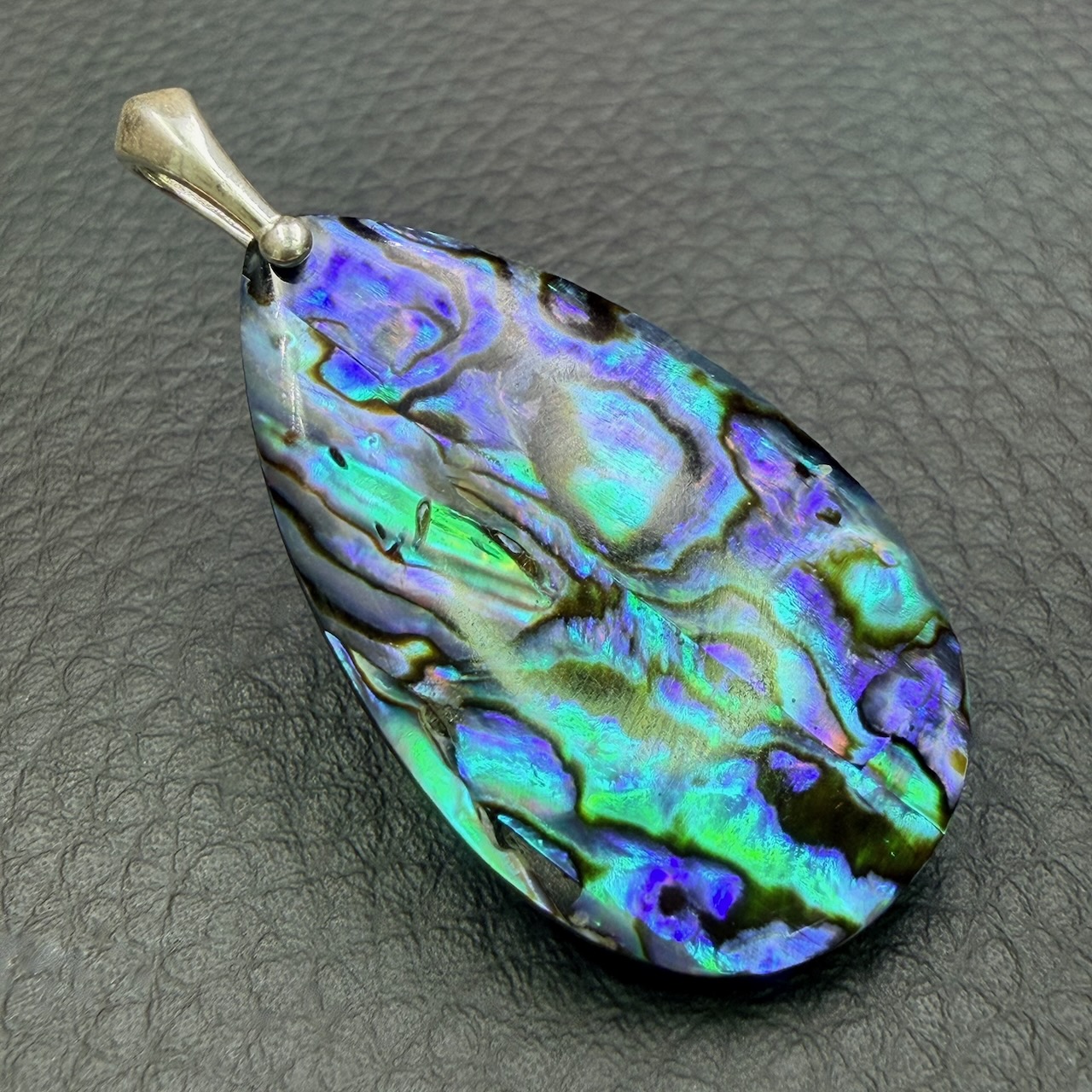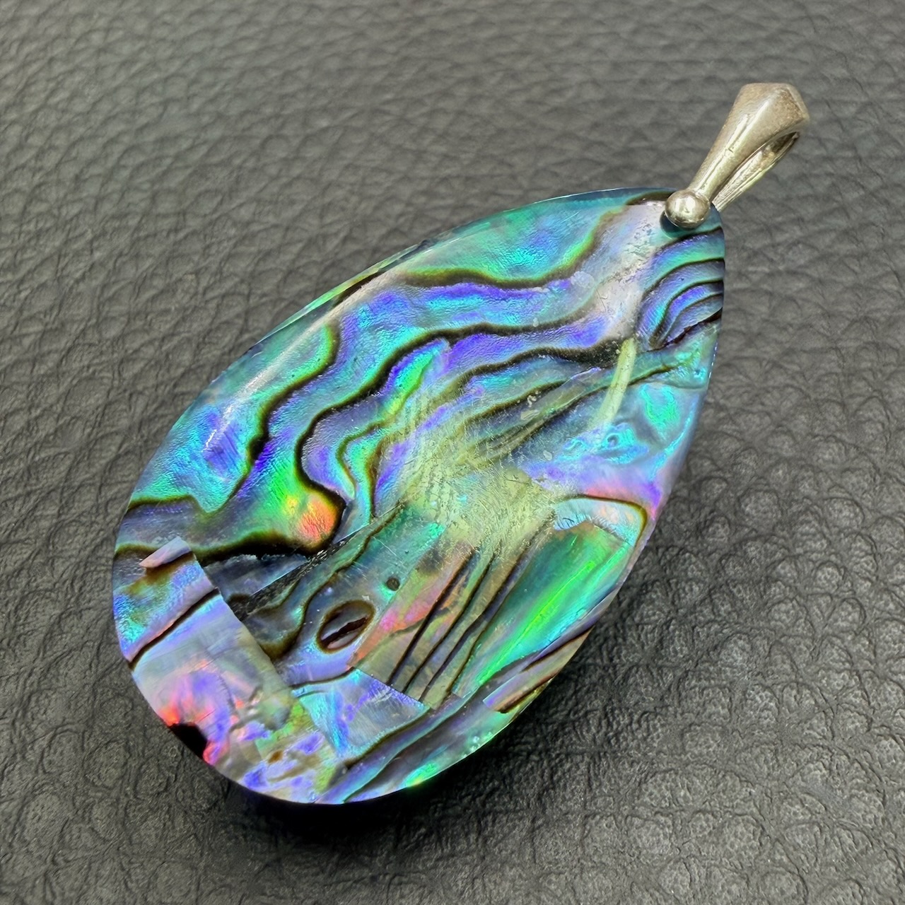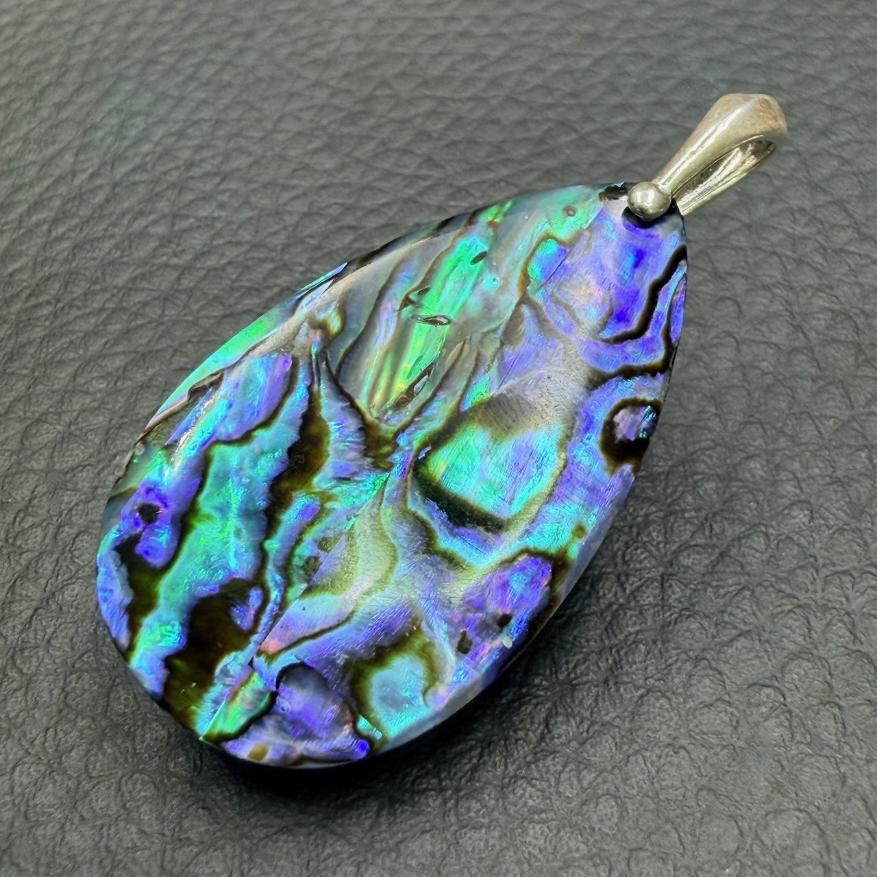 Taille du Pendentif en Nacre d’Abalone hors bélière 3,8 cm sur 2,2 cm sur 0,4 cm.
