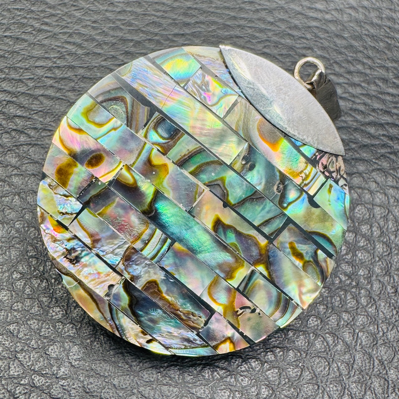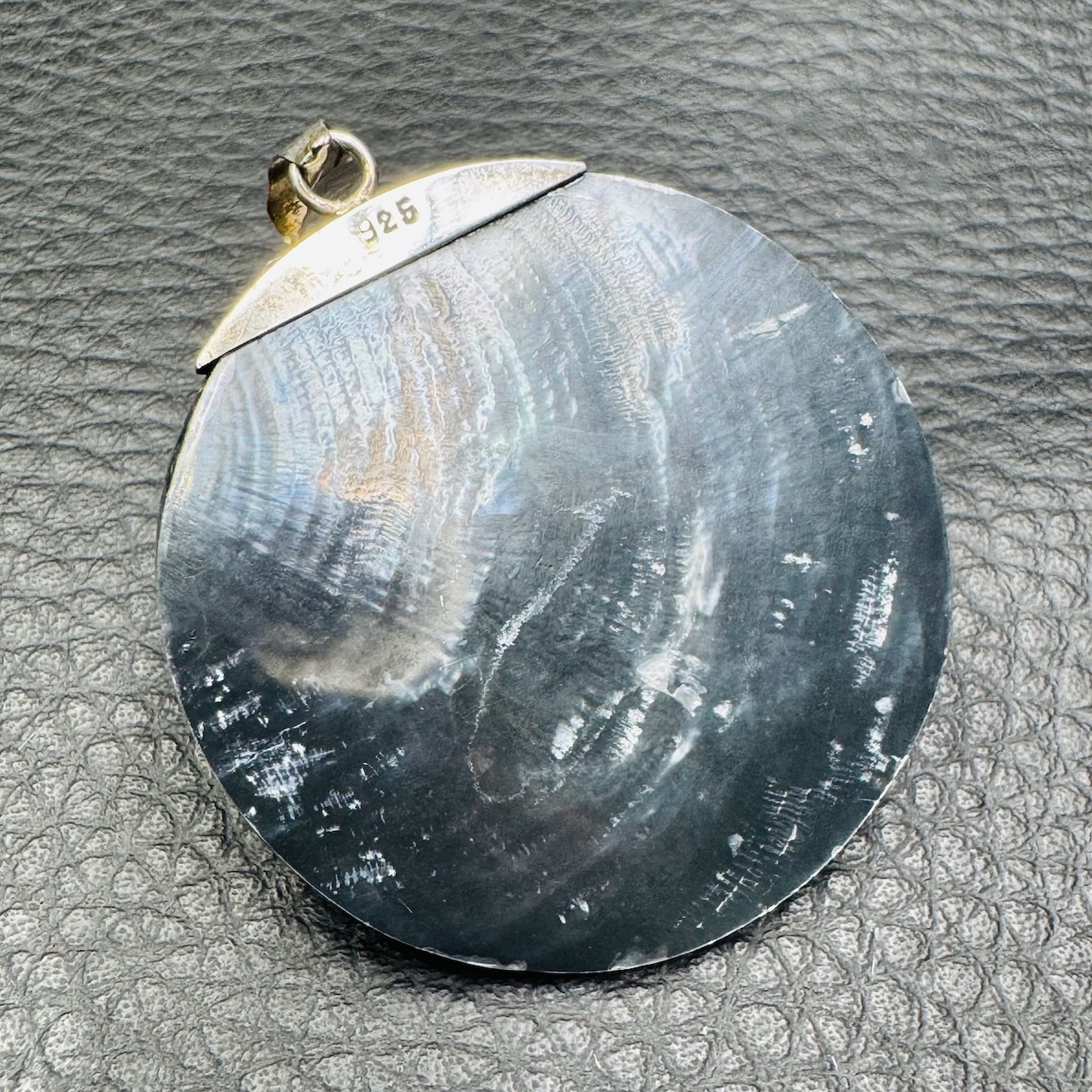 Taille du pendentif en Nacre d’abalone hors bélière 3,9 cm sur 3,9 cm sur 0,4 cm.