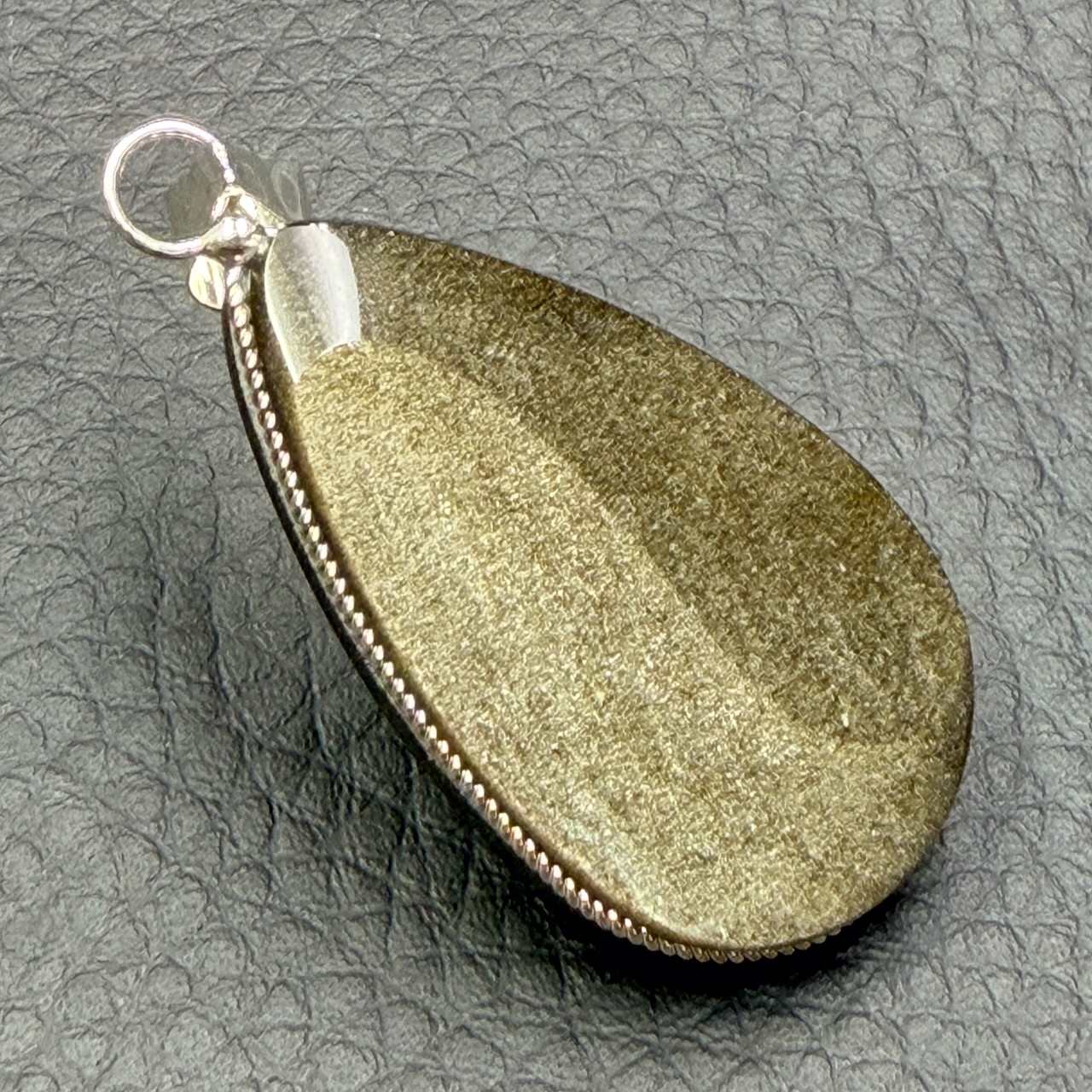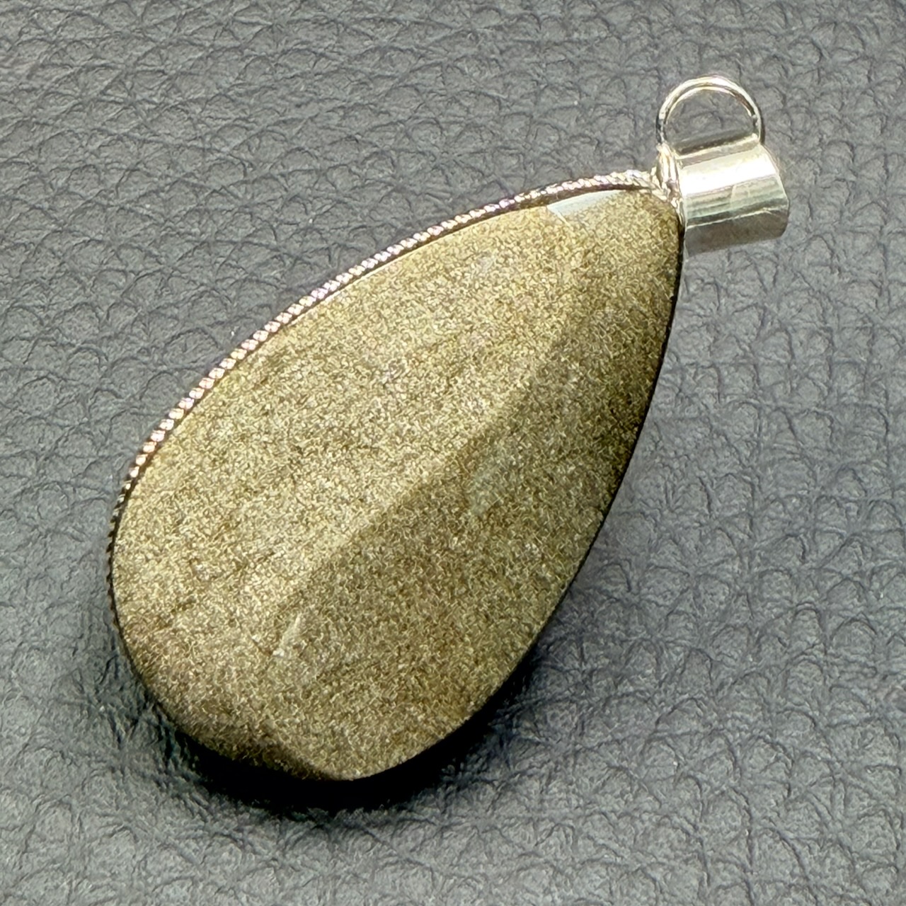 Taille du pendentif en obsidienne dorée 3,8 cm sur 2,3 cm sur 0,7 cm.