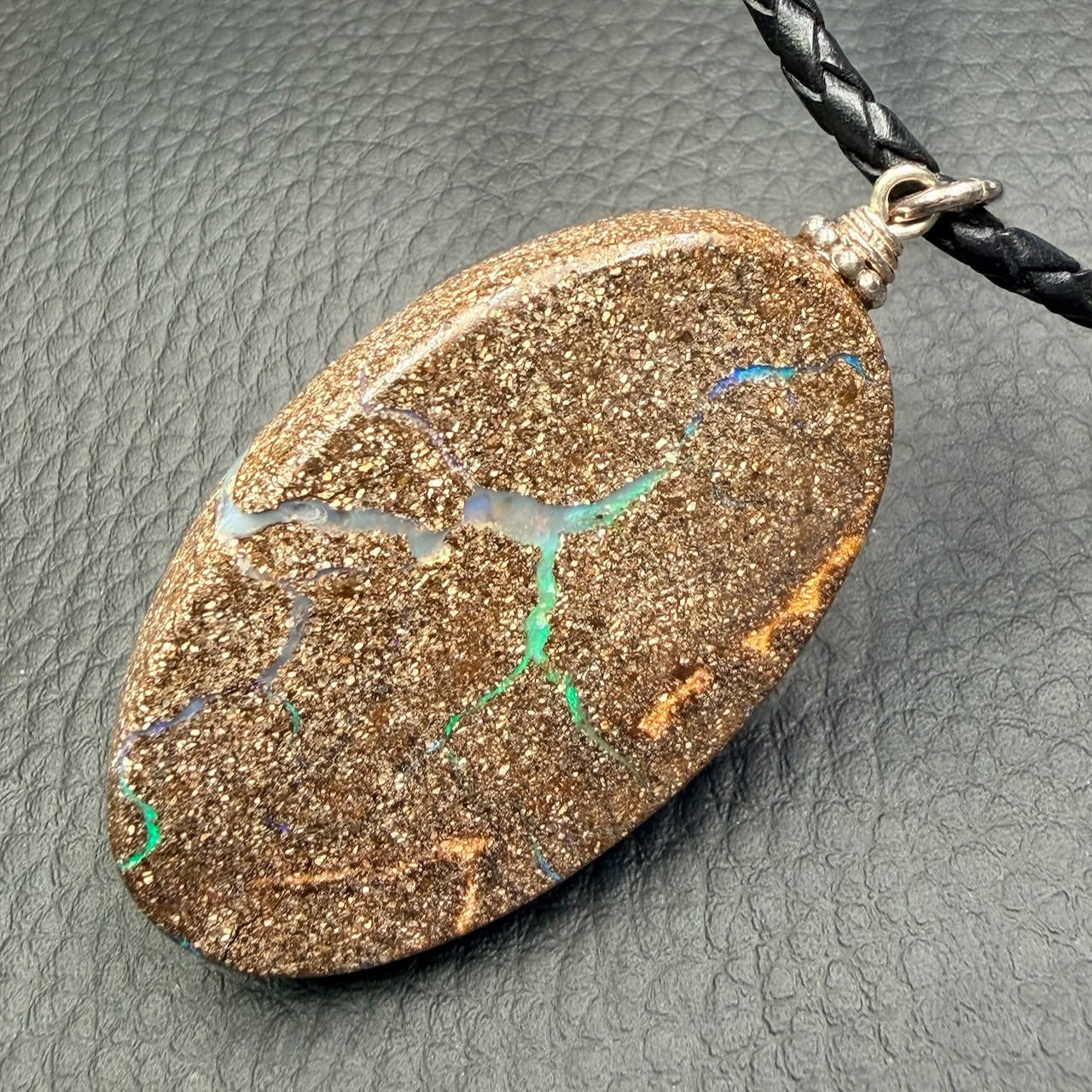 Le pendentif opale boulder est particulièrement intéressant car le contraste de la matrice rocheuse noire fait ressortir les multiples jeux lumineux de couleurs de l’opale. Pour les opales boulders, les jeux de couleurs sont le plus souvent dans des tons bleu-vert.