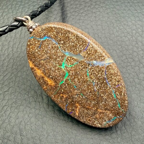 Elles sont emprisonnées dans du minerai de fer. On la taille généralement le pendentif en Opale boulder d’Australie de façon à laisser une partie de ce minerai autour des veines d’opale.