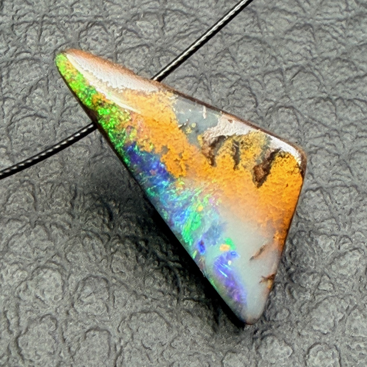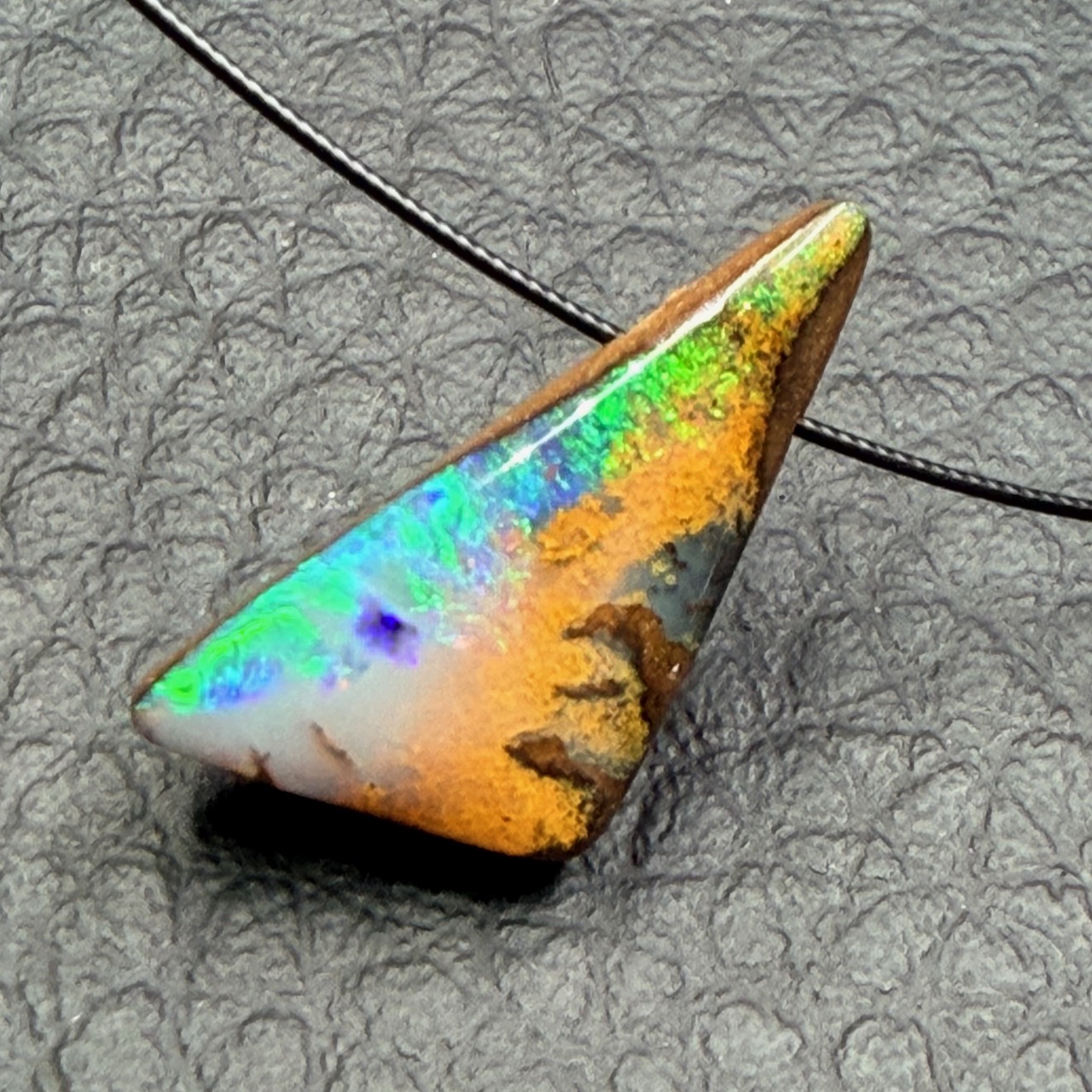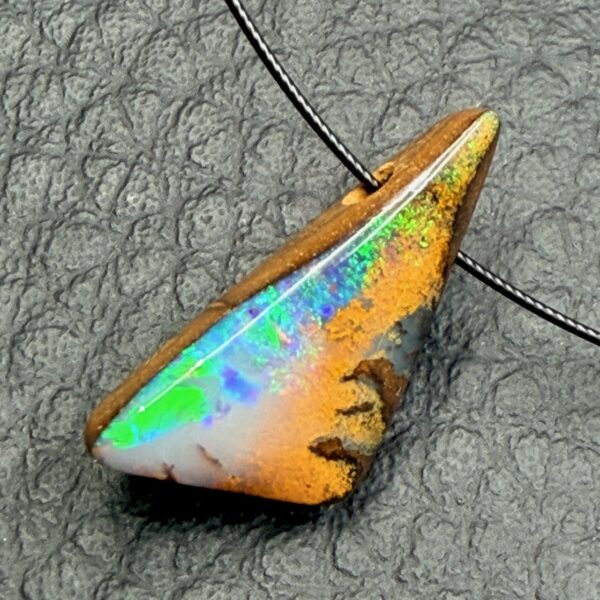 Le pendentif en opale boulder se distingue des autres types d’opales par sa formation unique et son lien avec la roche mère. Contrairement à l’opale précieuse, qui se forme dans des cavités entièrement dissociées de la roche, l’opale boulder se crée dans des fissures et des veines de fer ou de grès, où elle reste partiellement attachée à sa matrice.