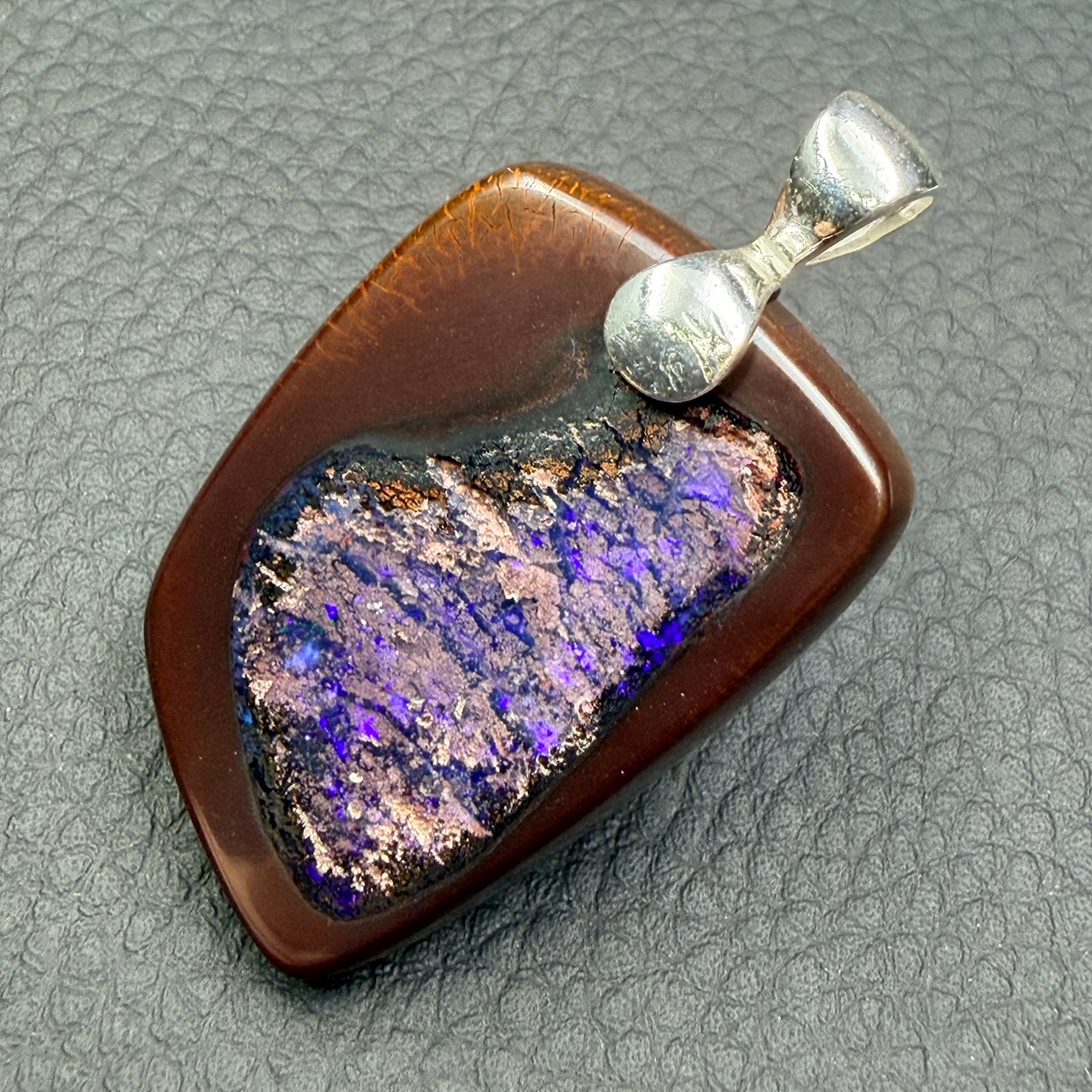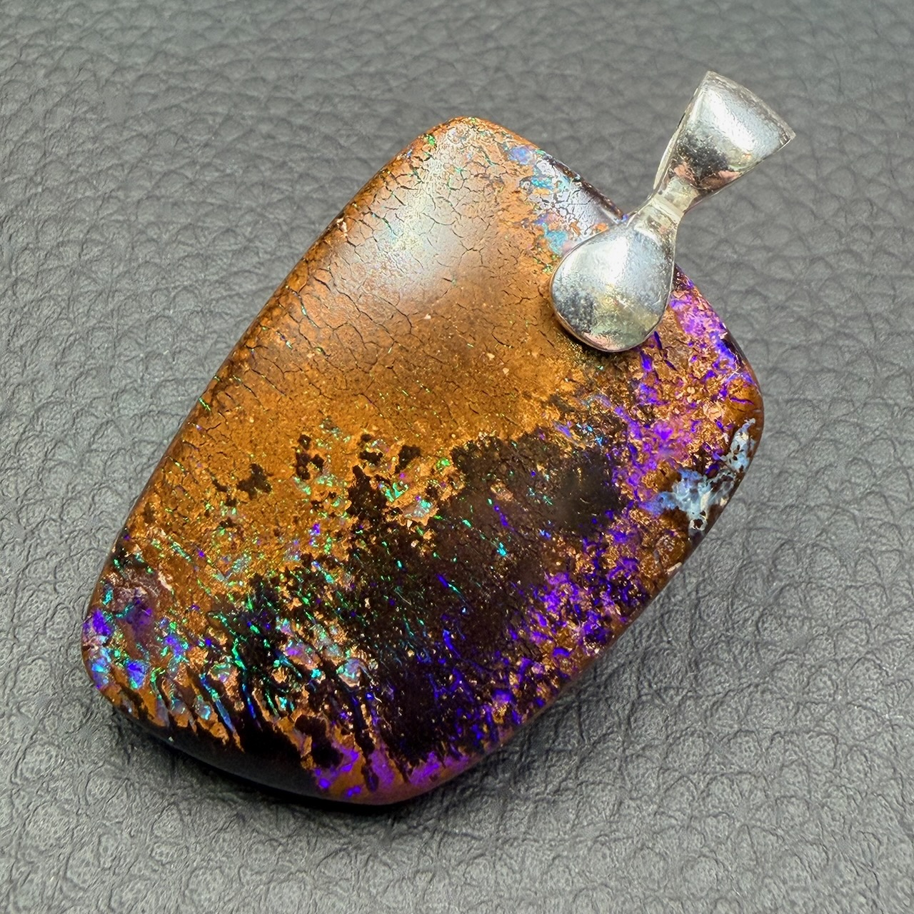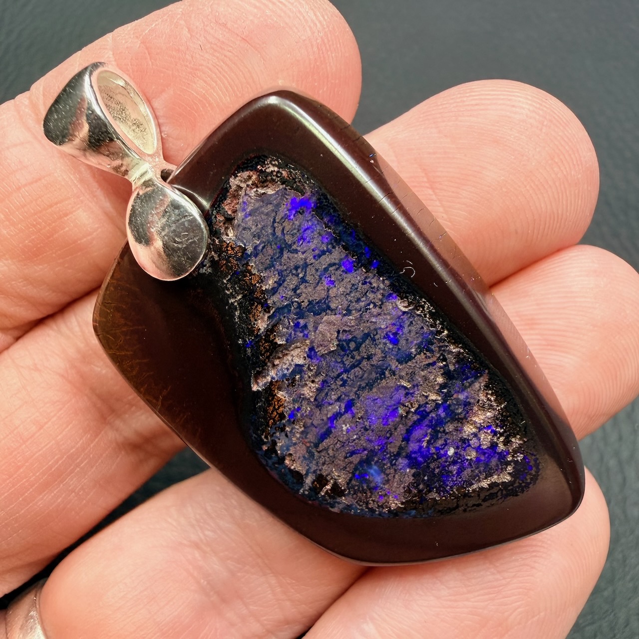 Ce qui distingue immédiatement le pendentif en Opale Boulder de toutes les autres opales, y compris l’Opale Noire de Lightning Ridge ou l’Opale Noire de Coober Pedy, c’est ce contraste fondamental et saisissant : le feu chatoyant de la silice hydratée qui danse sur un fond sombre et terrien.