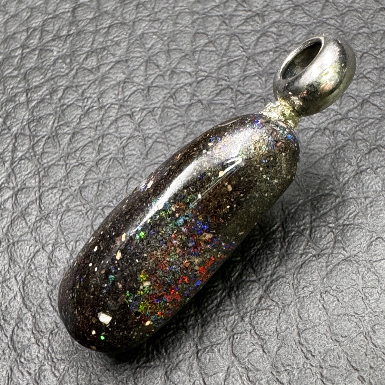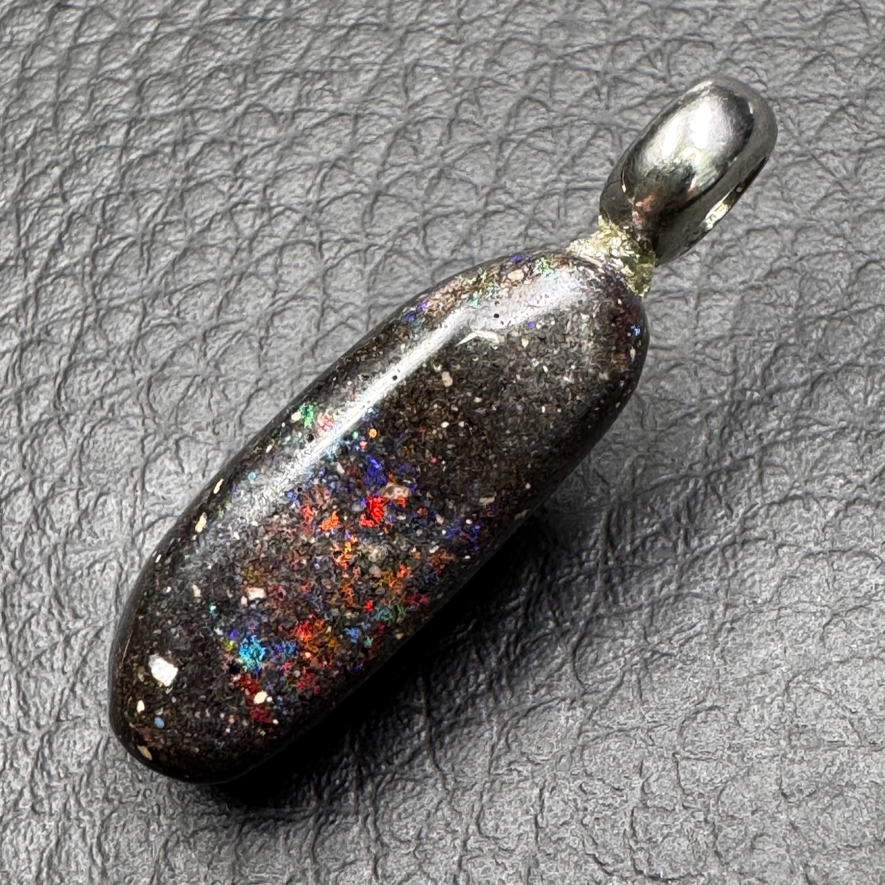 Le pendentif en opale noire se distingue par des reflets irisés selon l’angle de vision, rappelant l’arc-en-ciel, qui ont donné le terme « opalescent ». Gel de silice hydraté, elle ne cristallise pas.
