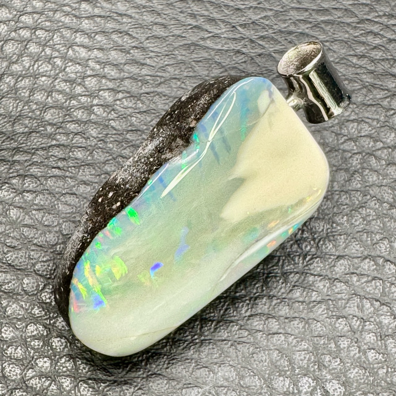 La surface iridescente de l’opale noire, souvent décrite comme « opalescente », change de couleur en fonction de l’angle de la lumière, créant des effets visuels comparables à un arc-en-ciel emprisonné dans la pierre.