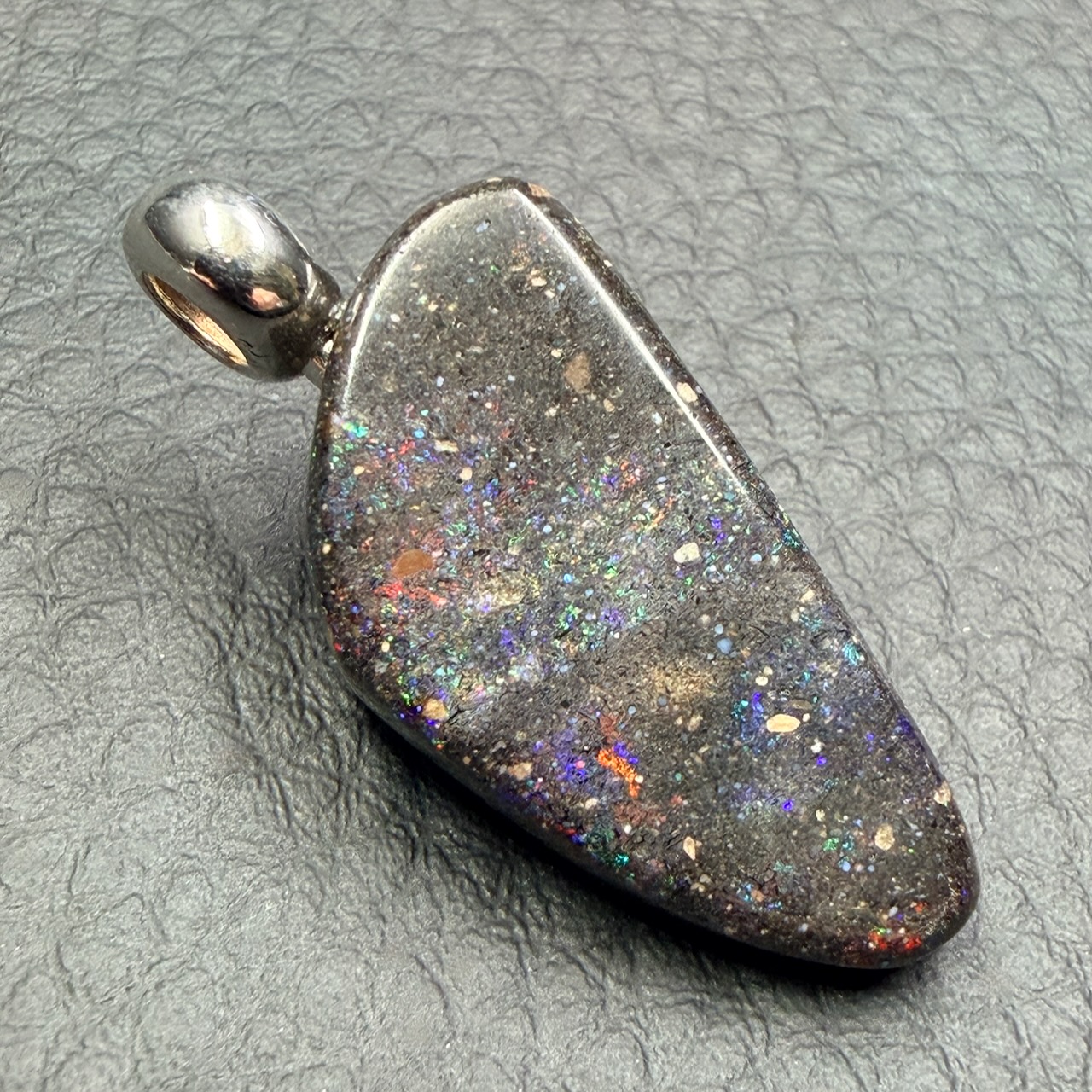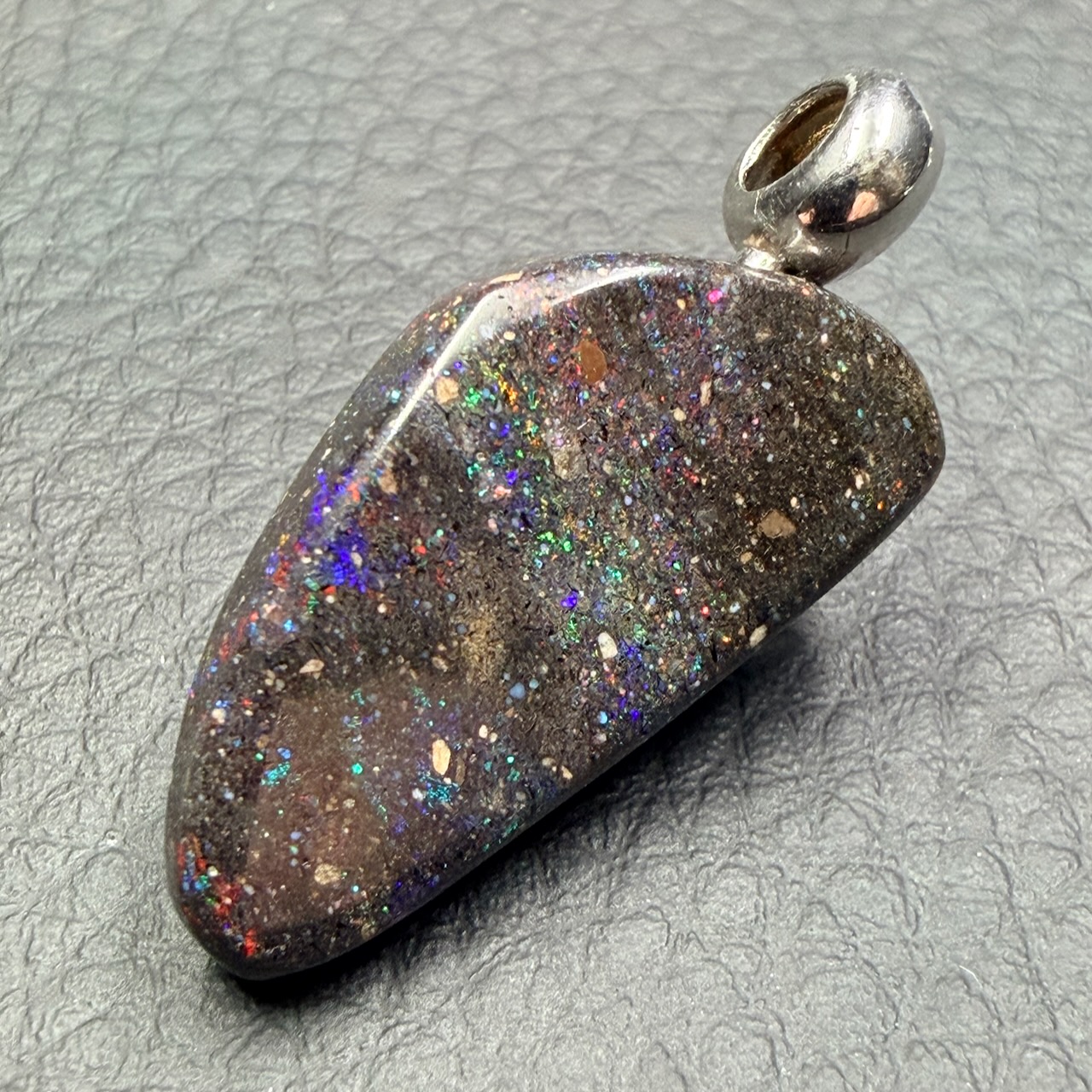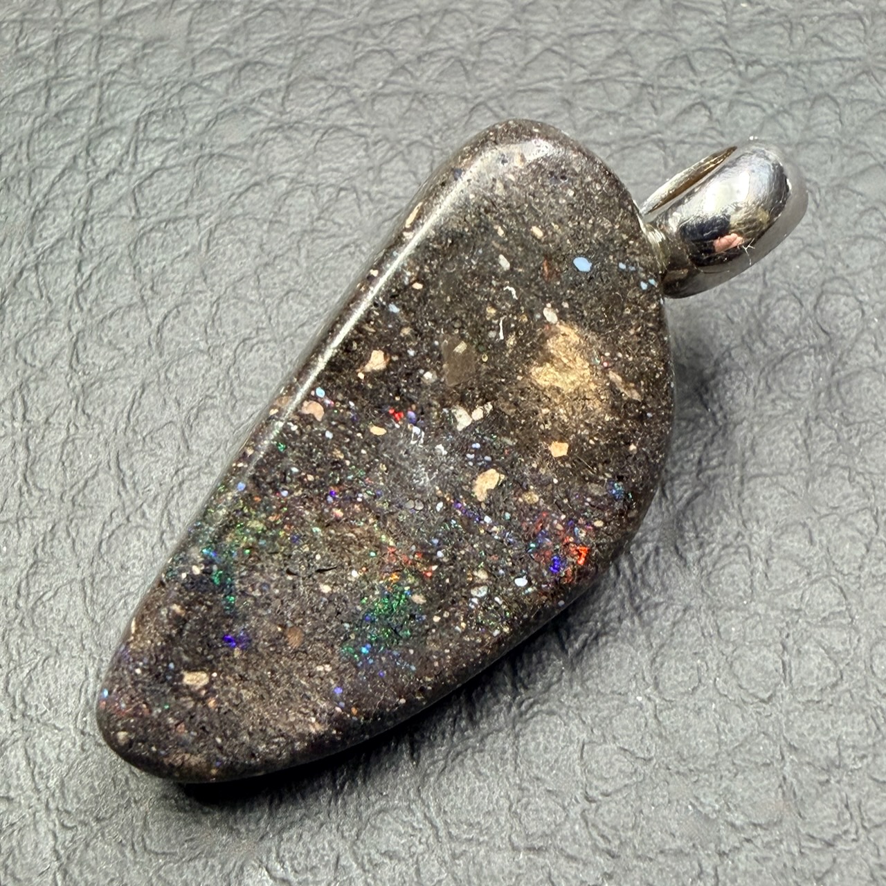 Le pendentif en opale noire se distingue par des reflets irisés selon l’angle de vision, rappelant l’arc-en-ciel, qui ont donné le terme « opalescent ». Gel de silice hydraté, elle ne cristallise pas.