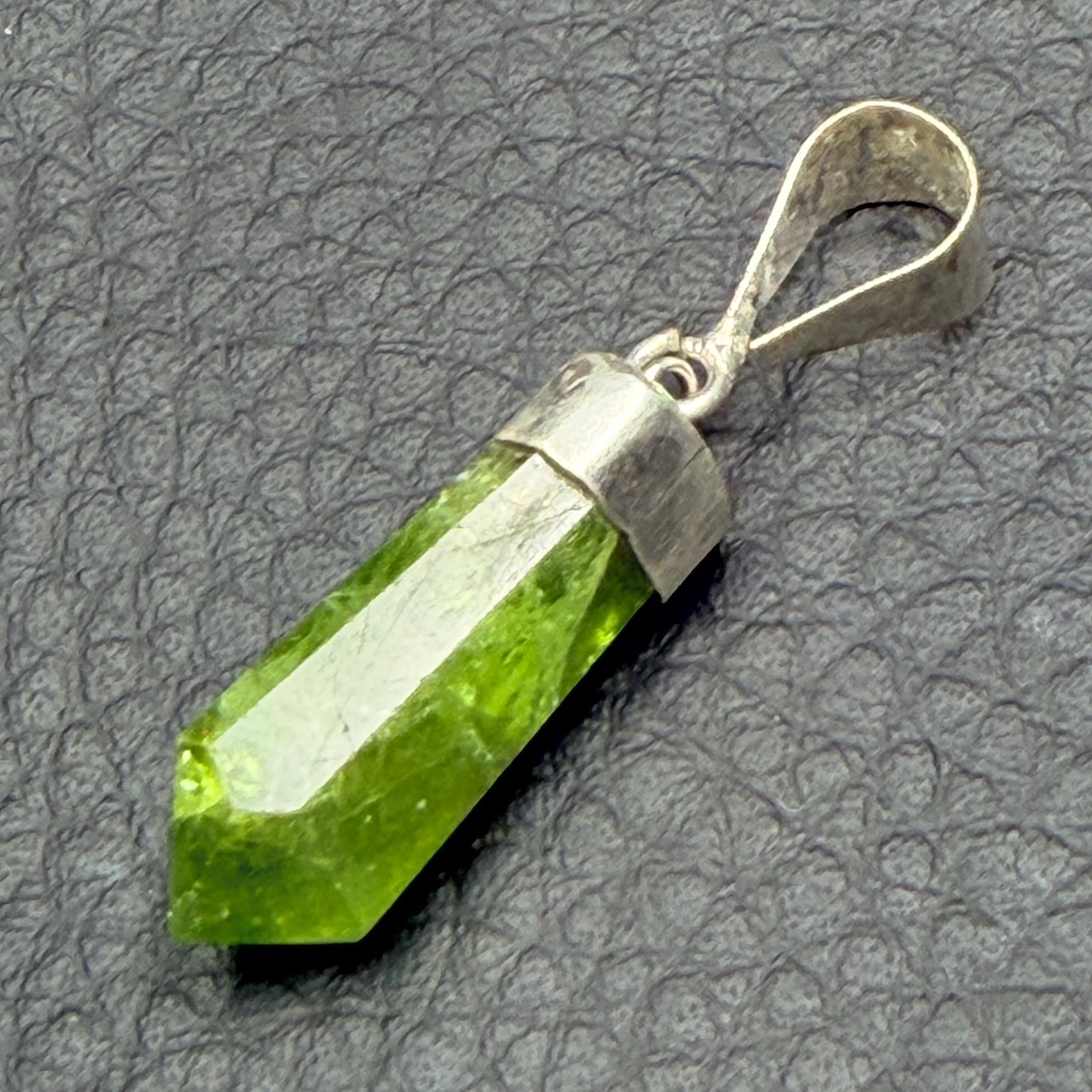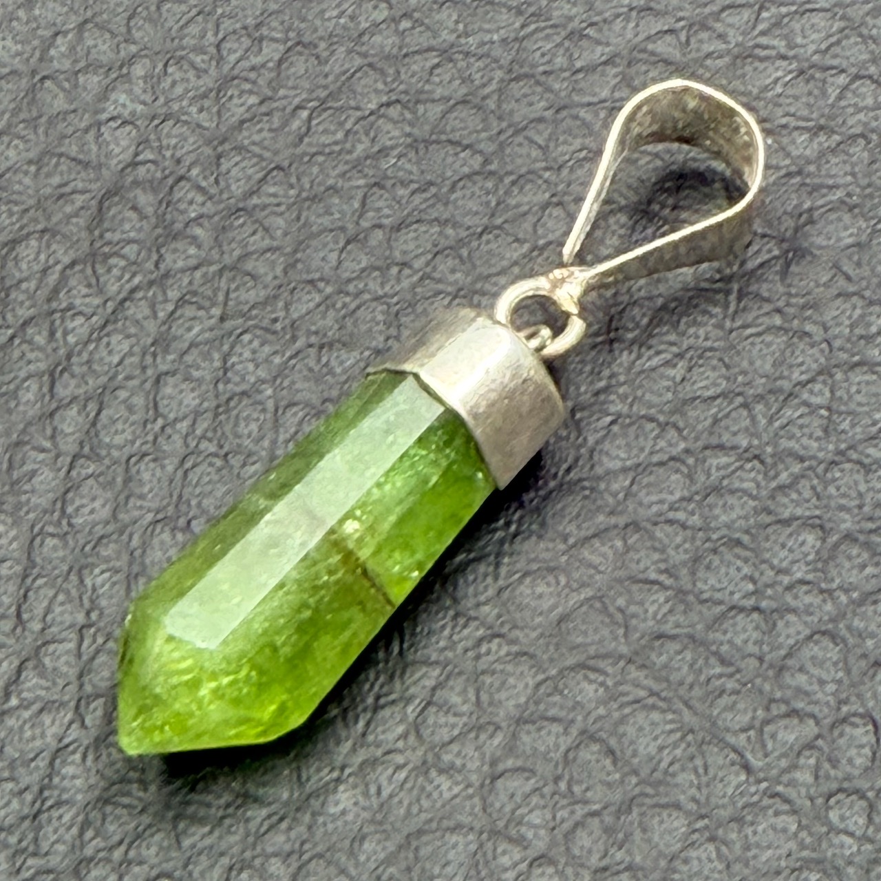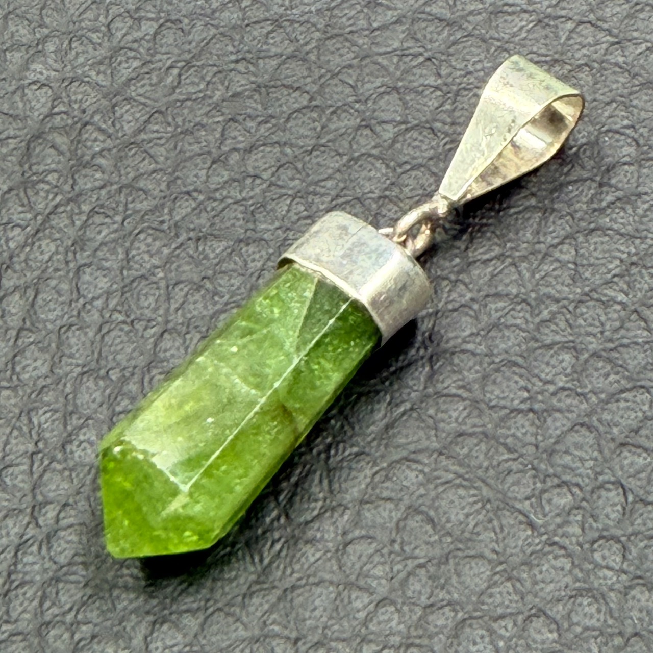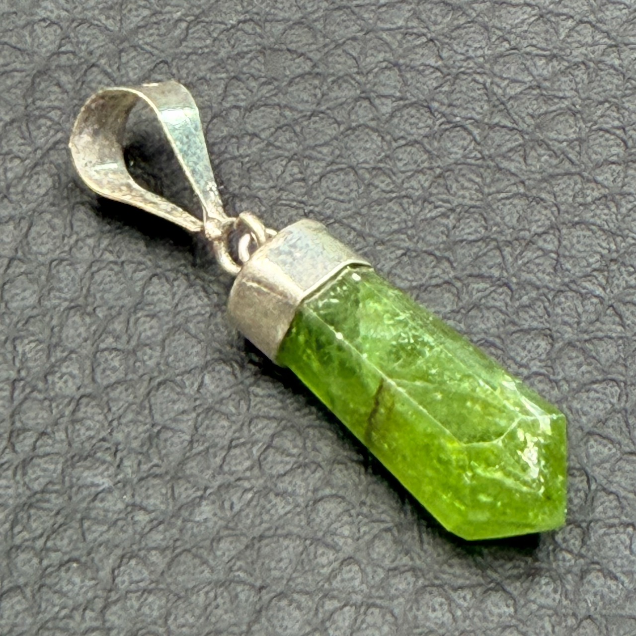 Taille du Pendentif en Péridot hors bélière 2,1 cm sur 0,8 cm sur 0,7 cm.