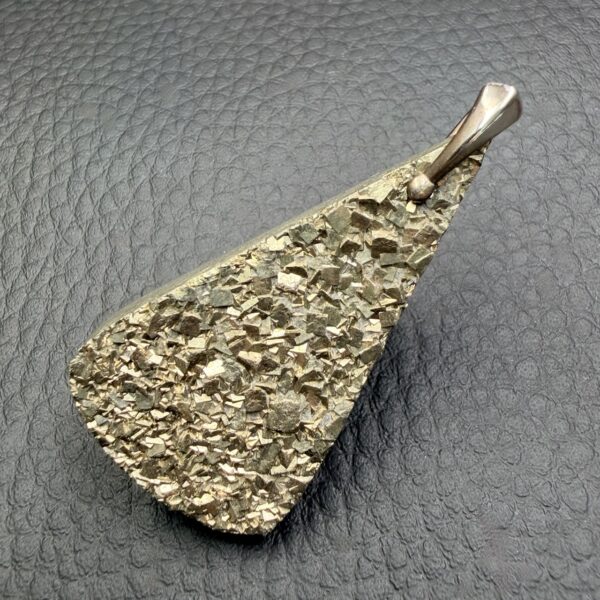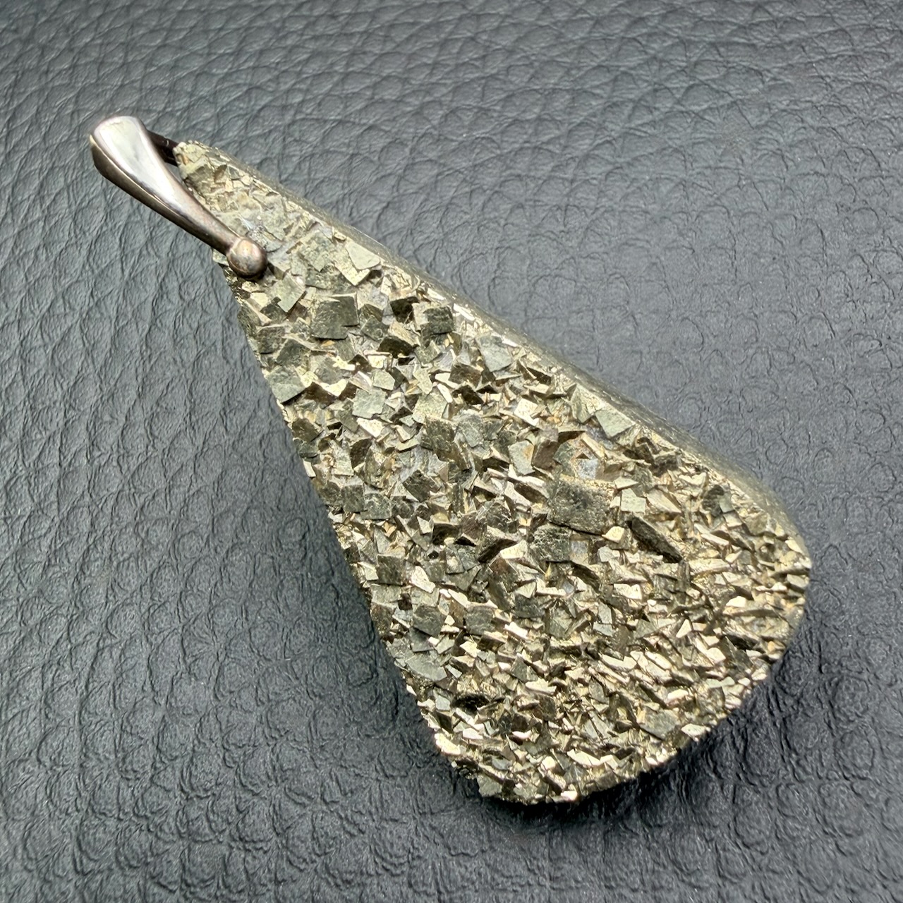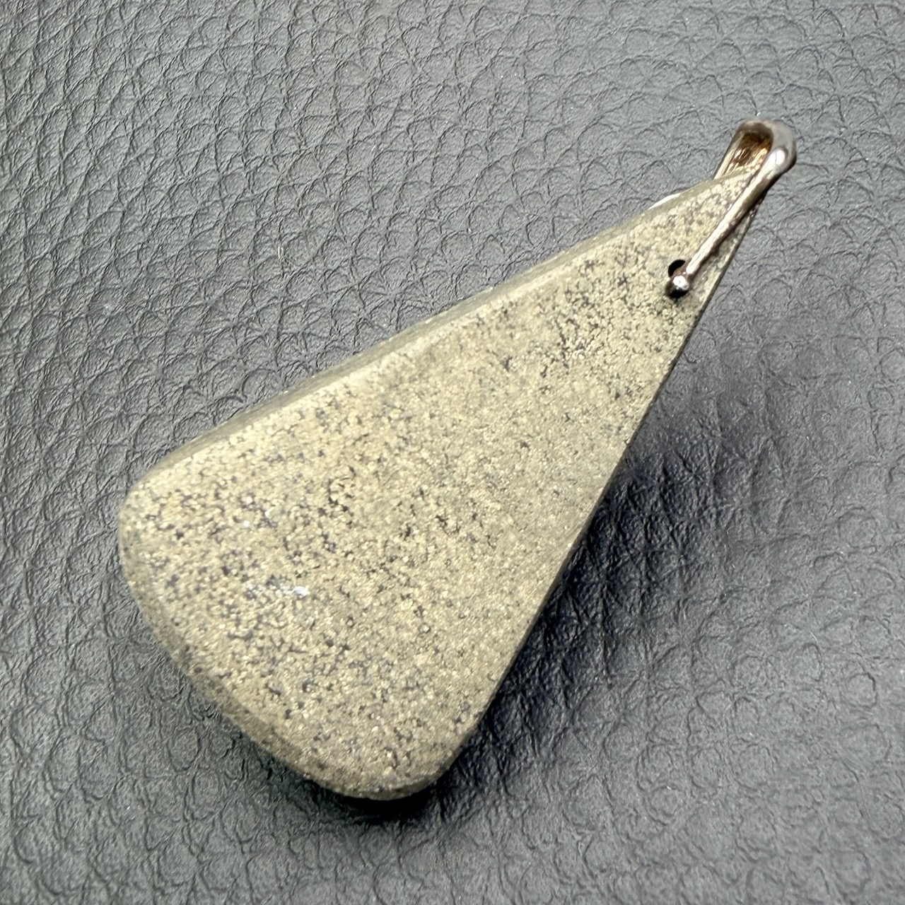 Taille du pendentif en pyrite hors bélière 4,3 cm sur 2,4 cm sur 0,7 cm.