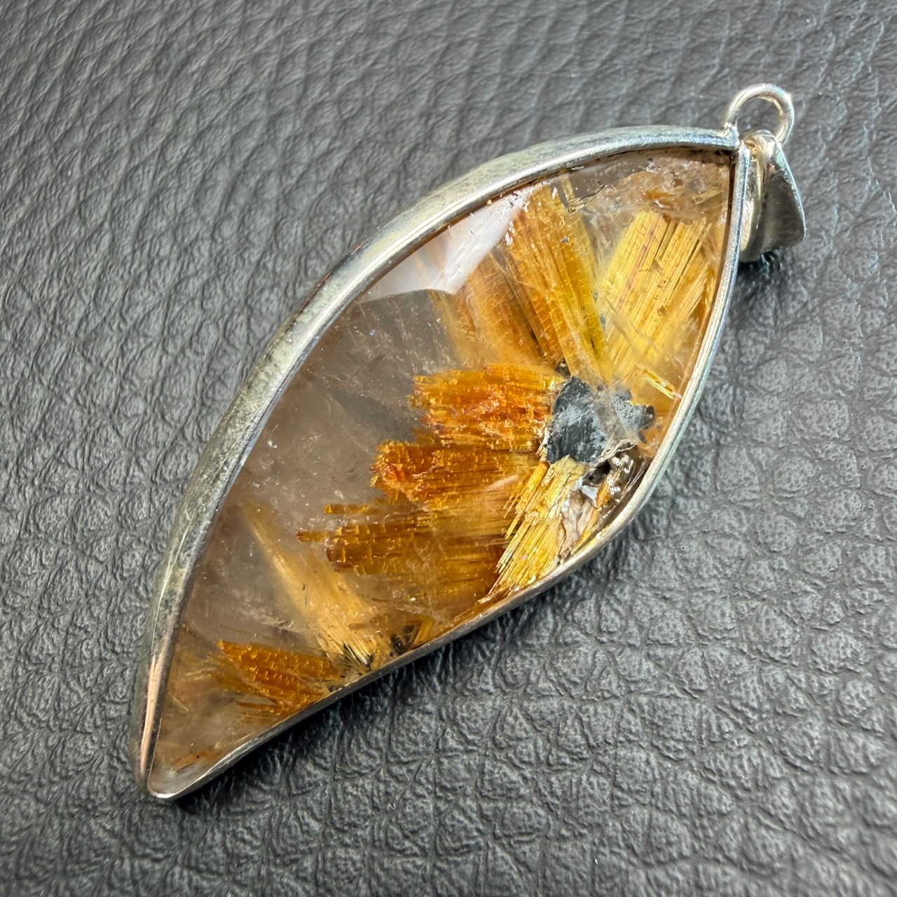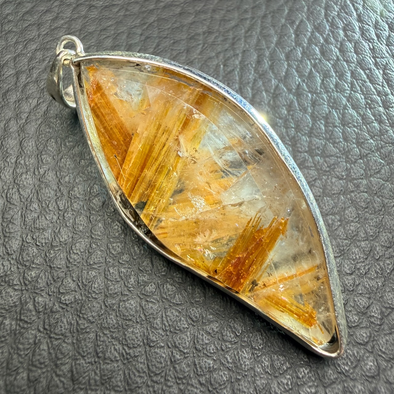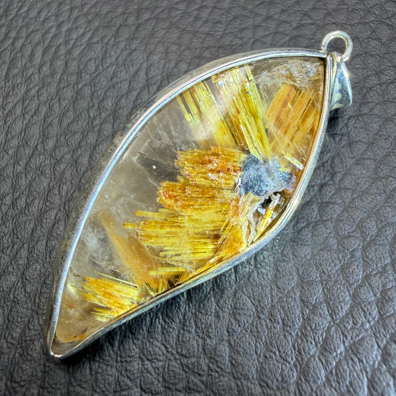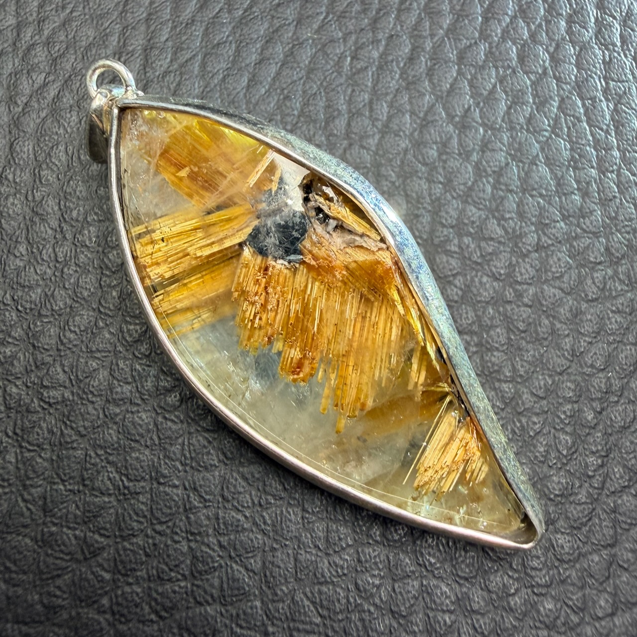 La forme allongée du pendentif en quartz rutile doré permet de suivre la distribution des inclusions sur toute la longueur. L’orientation de la pierre a été choisie pour exposer les zones les plus riches en rutile.