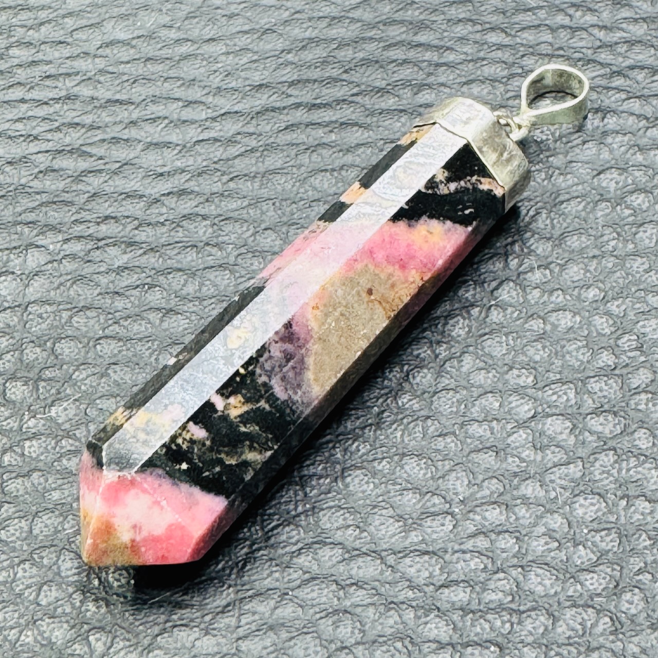 Taille du Pendentif en Rhodonite hors bélière 4,2 cm sur 1 cm sur 0,7 cm.