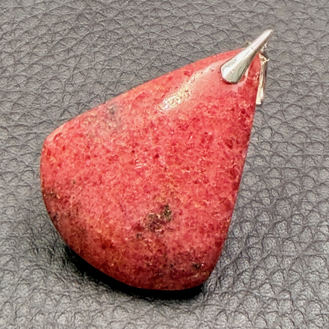 Taille du Pendentif en Rhodonite hors bélière 3,7 cm sur 3 cm sur 0,6 cm.