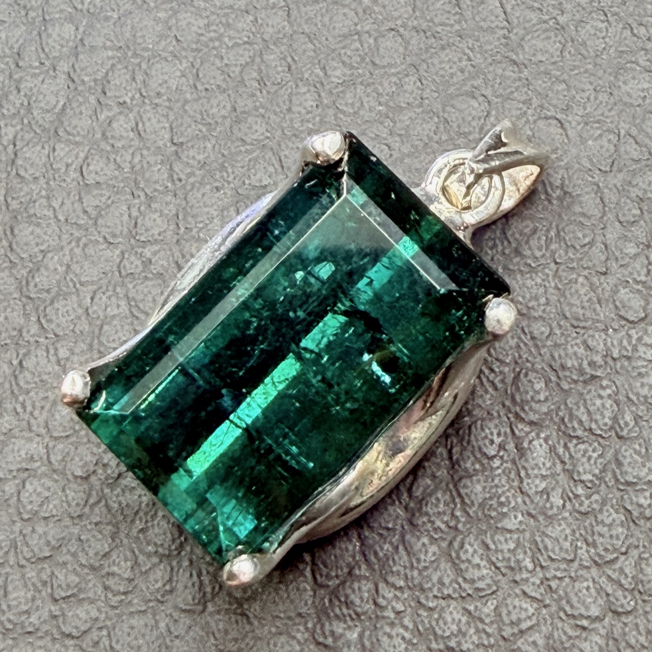 Cette composition influe non seulement sur la teinte mais aussi sur la dispersion de la lumière à l’intérieur du cristal : d’où ces reflets et ces variations d’intensité qui font la singularité visuelle du pendentif.