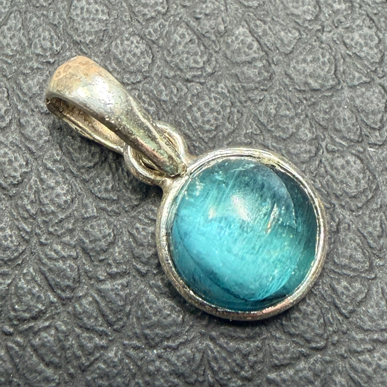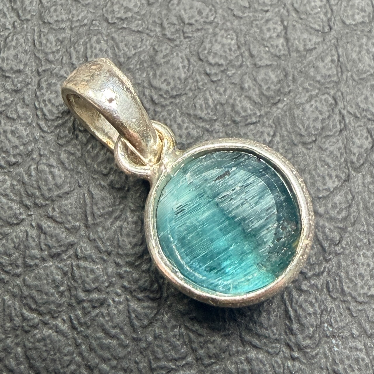 Taille du pendentif en tourmaline bleue hors bélière : 0,7 cm sur 0,7 cm sur 0,4 cm.
