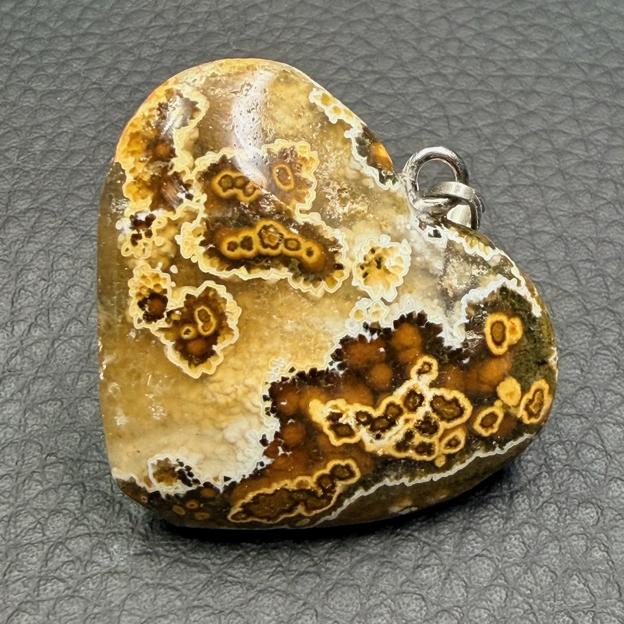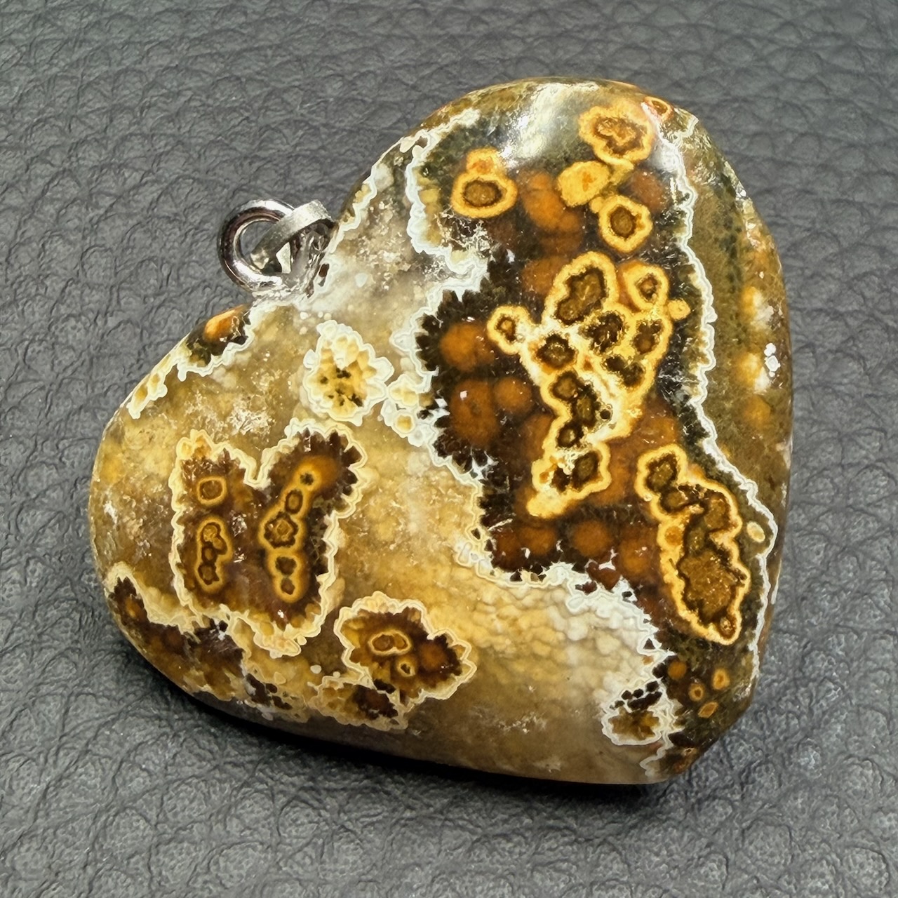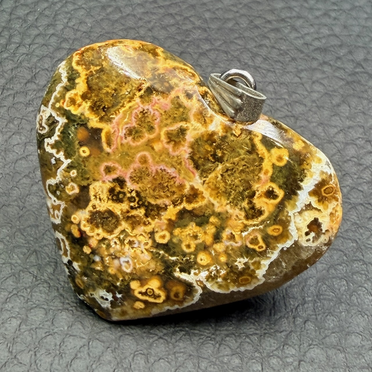 Taille du pendentif jaspe orbiculaire hors bélière 3,2 cm sur 3,8 cm sur 1 cm.