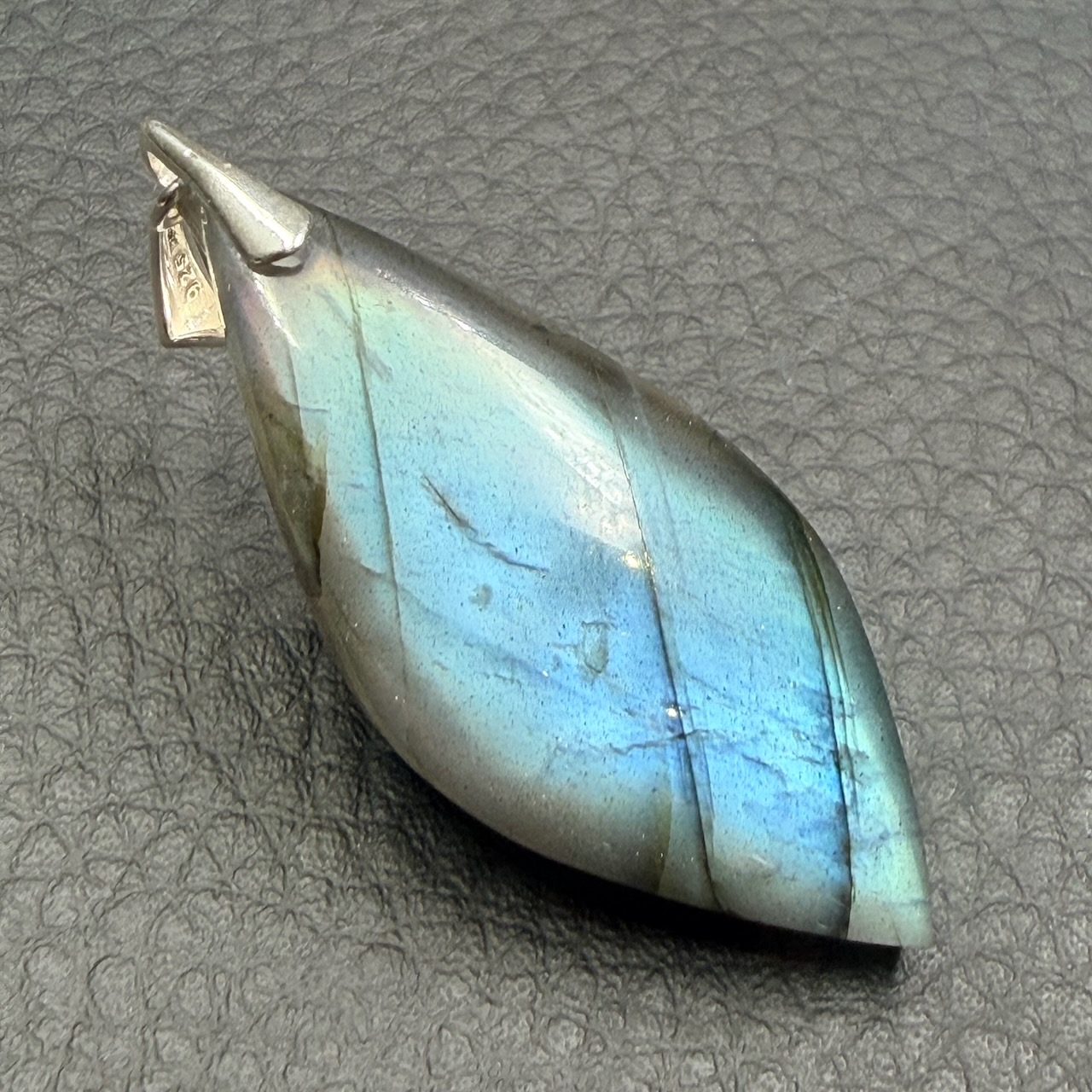 Taille du Pendentif Labradorite Bleu Lagon hors bélière 4,3 cm sur 1,9 cm sur 0,8 cm.