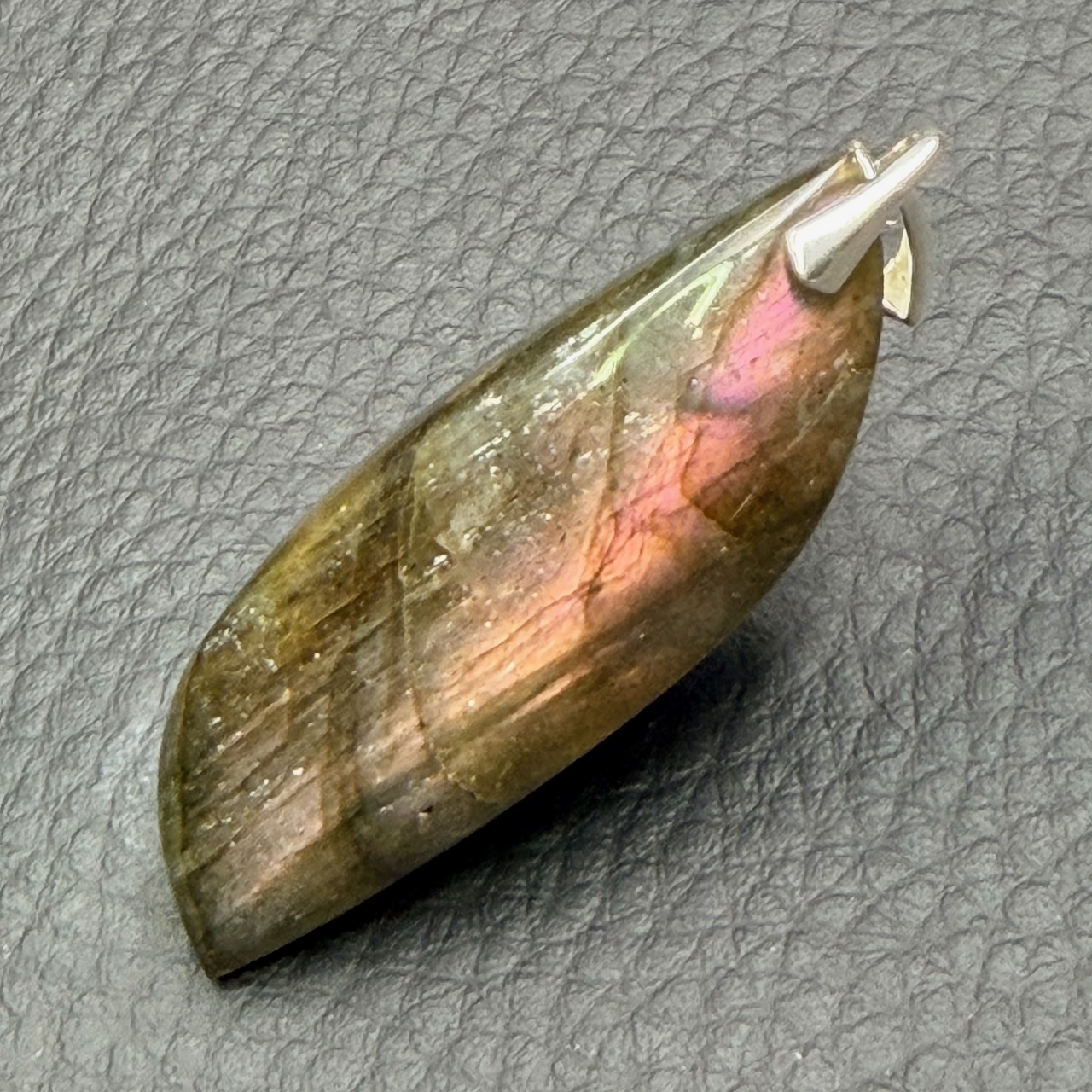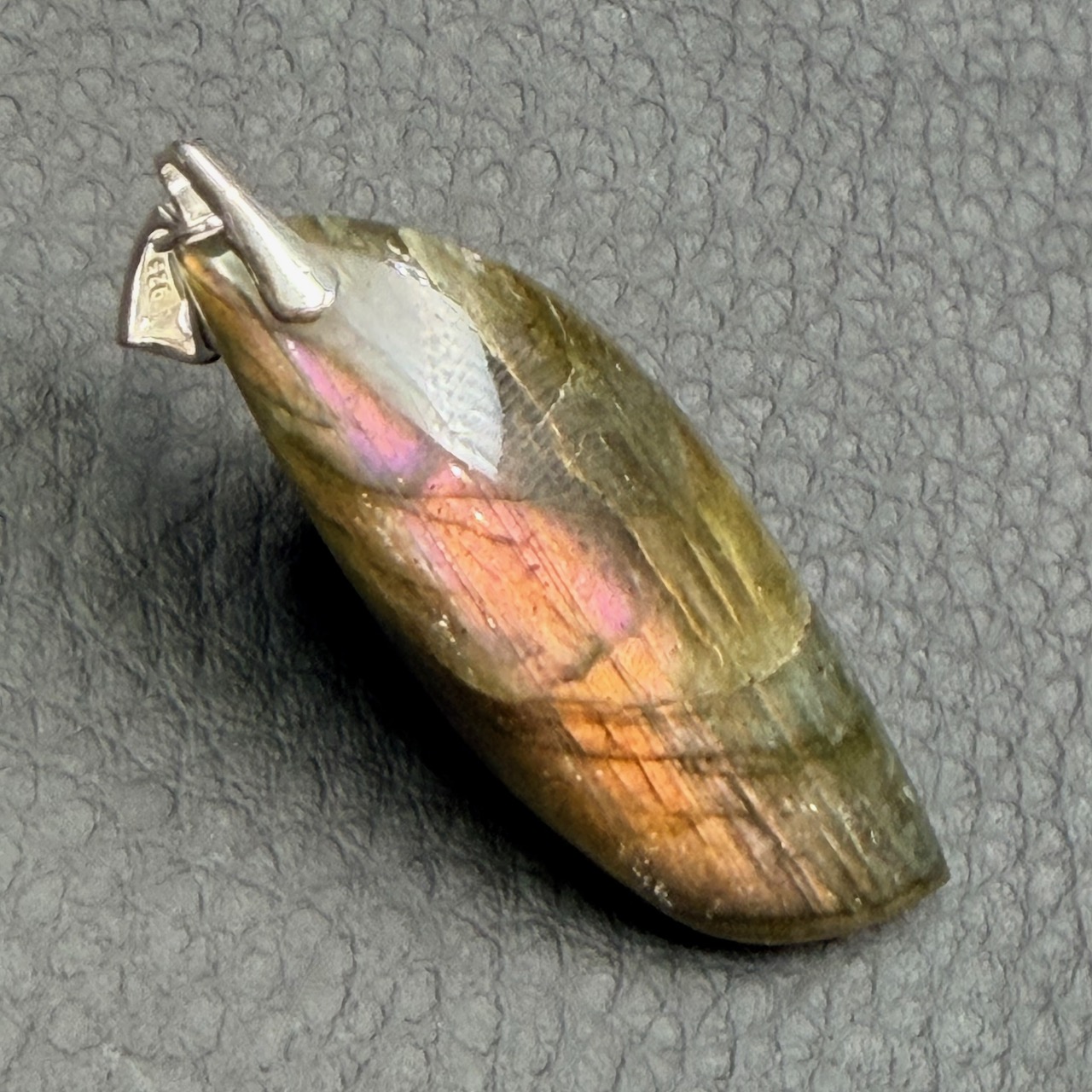 Taille du Pendentif labradorite spectrolite hors bélière 4,7 cm sur 1,6 cm sur 0,8 cm.