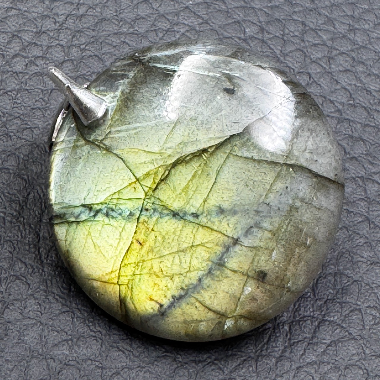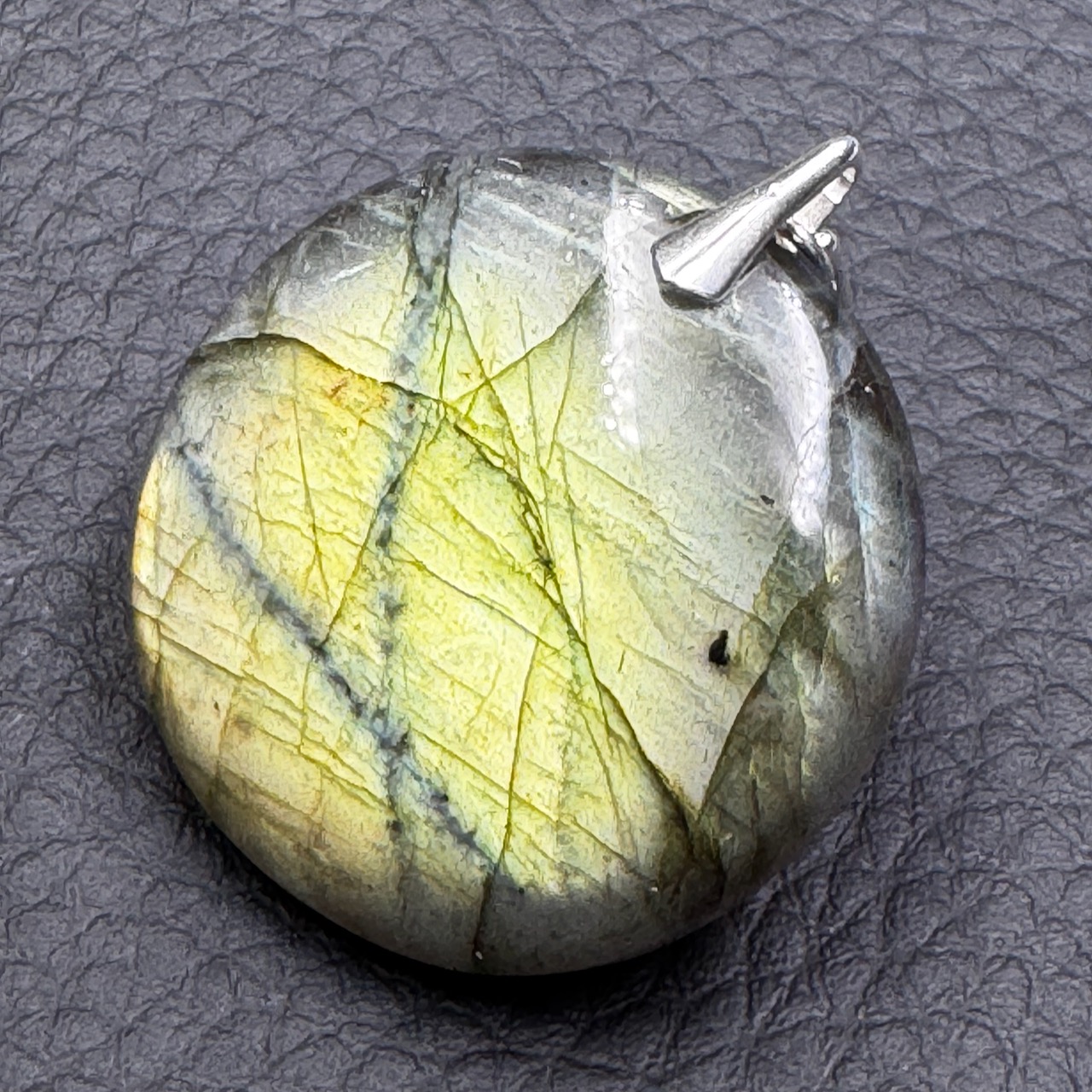 Taille du Pendentif Labradorite Verte hors bélière 3,1 cm sur 3,1 cm sur 0,7 cm.
