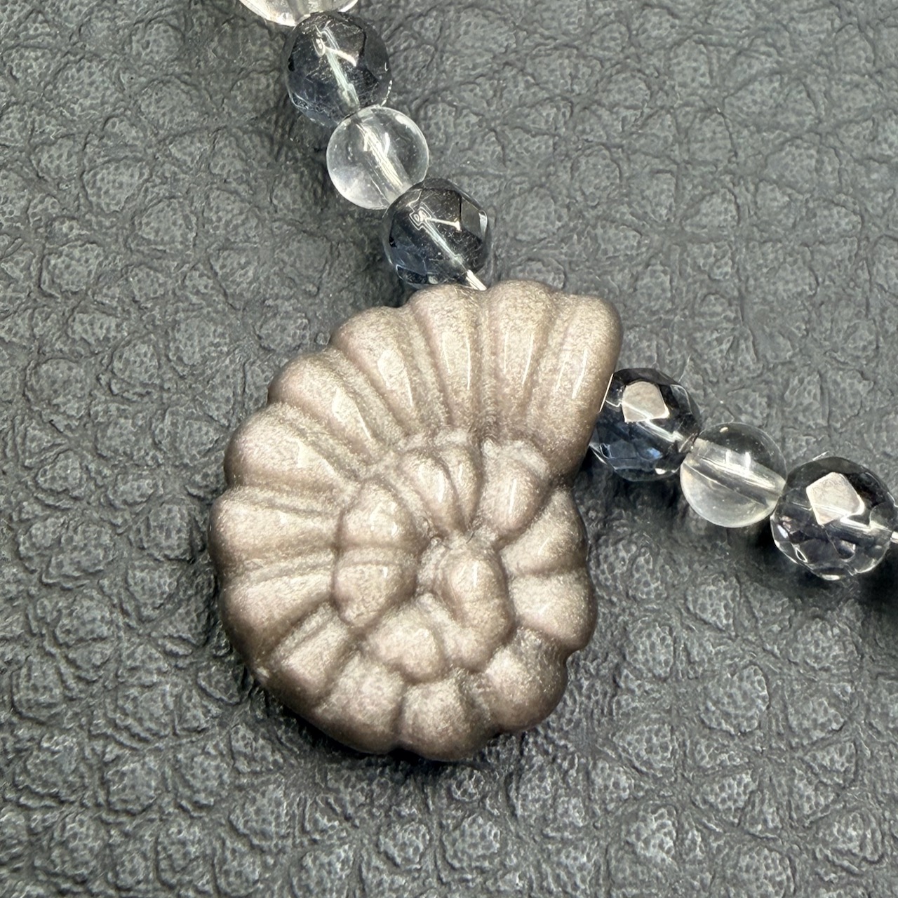 Entre la force visuelle de l’obsidienne argentée en forme d’ammonite, la délicatesse des perles de cristal de roche, la douceur du quartz gris et l’esprit de l’artisanat mexicain, ce bijou compose un ensemble harmonieux et plein de personnalité.