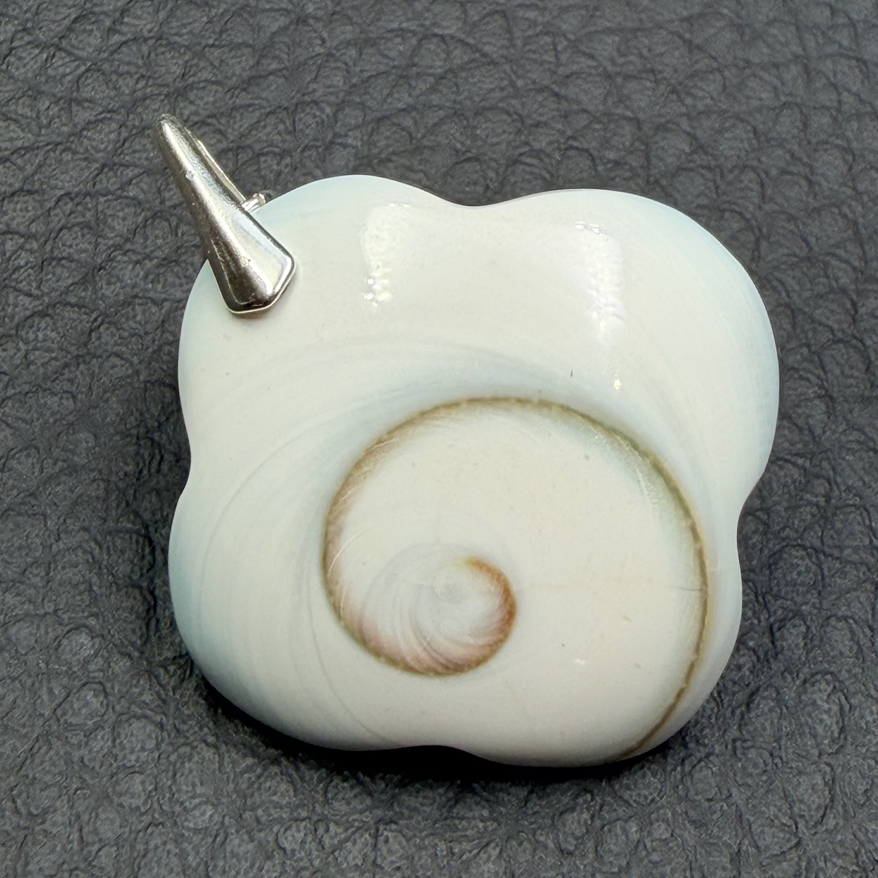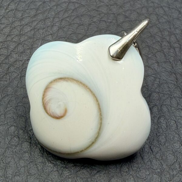 D’un côté, il offre une surface plate, délicate, ornée d’une spirale sur un fond clair, tandis que de l’autre, il présente une forme bombée, agrémentée d’une tache aux teintes vibrantes, oscillant entre l’orange et le vert, sur un fond immaculé. Cette configuration évoque de manière saisissante la silhouette d’un œil, conférant à cette gemme une signification symbolique profonde.