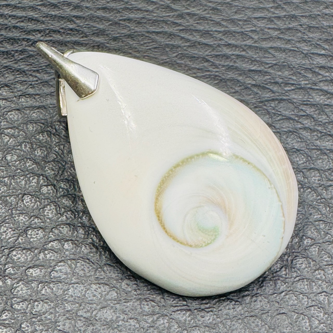 D’un côté, il offre une surface plate, délicate, ornée d’une spirale sur un fond clair, tandis que de l’autre, il présente une forme bombée, agrémentée d’une tache aux teintes vibrantes, oscillant entre l’orange et le vert, sur un fond immaculé. Cette configuration évoque de manière saisissante la silhouette d’un œil, conférant à cette gemme une signification symbolique profonde.