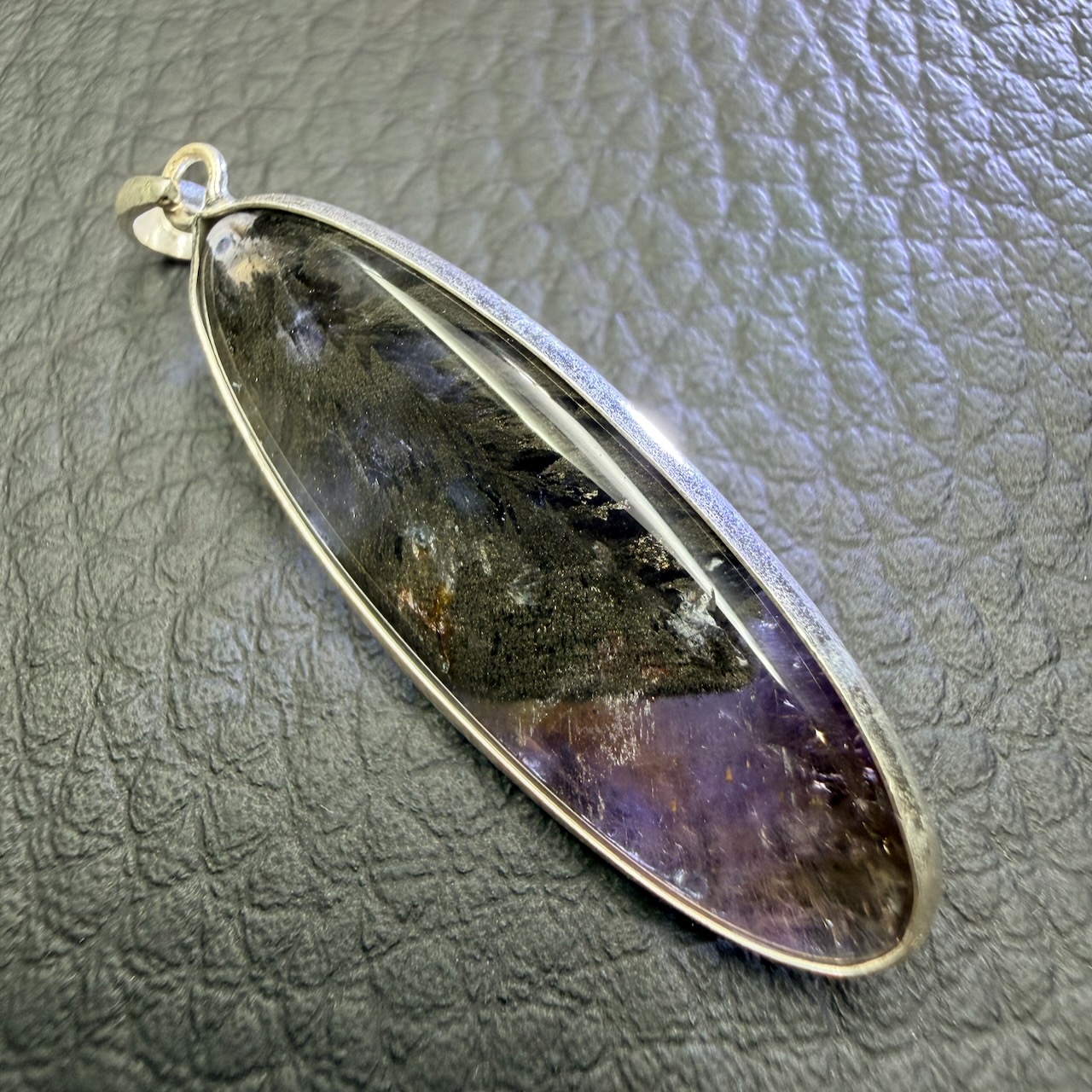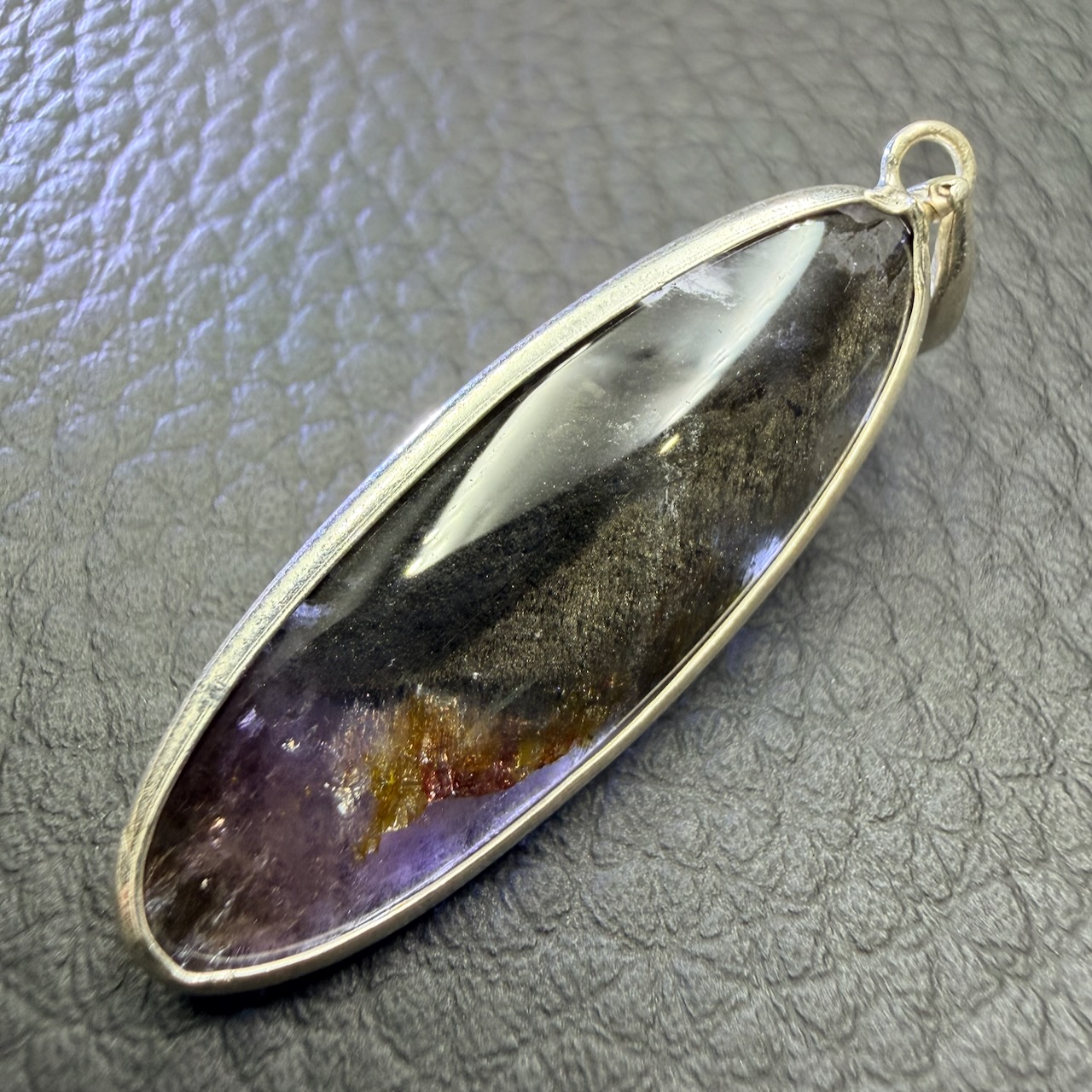 Ce mélange naturel, quasi-alchimique, confère au Pendentif Super Seven une apparence chatoyante, parfois striée de reflets métalliques, d’inclusions dorées ou de nuages améthystins.
