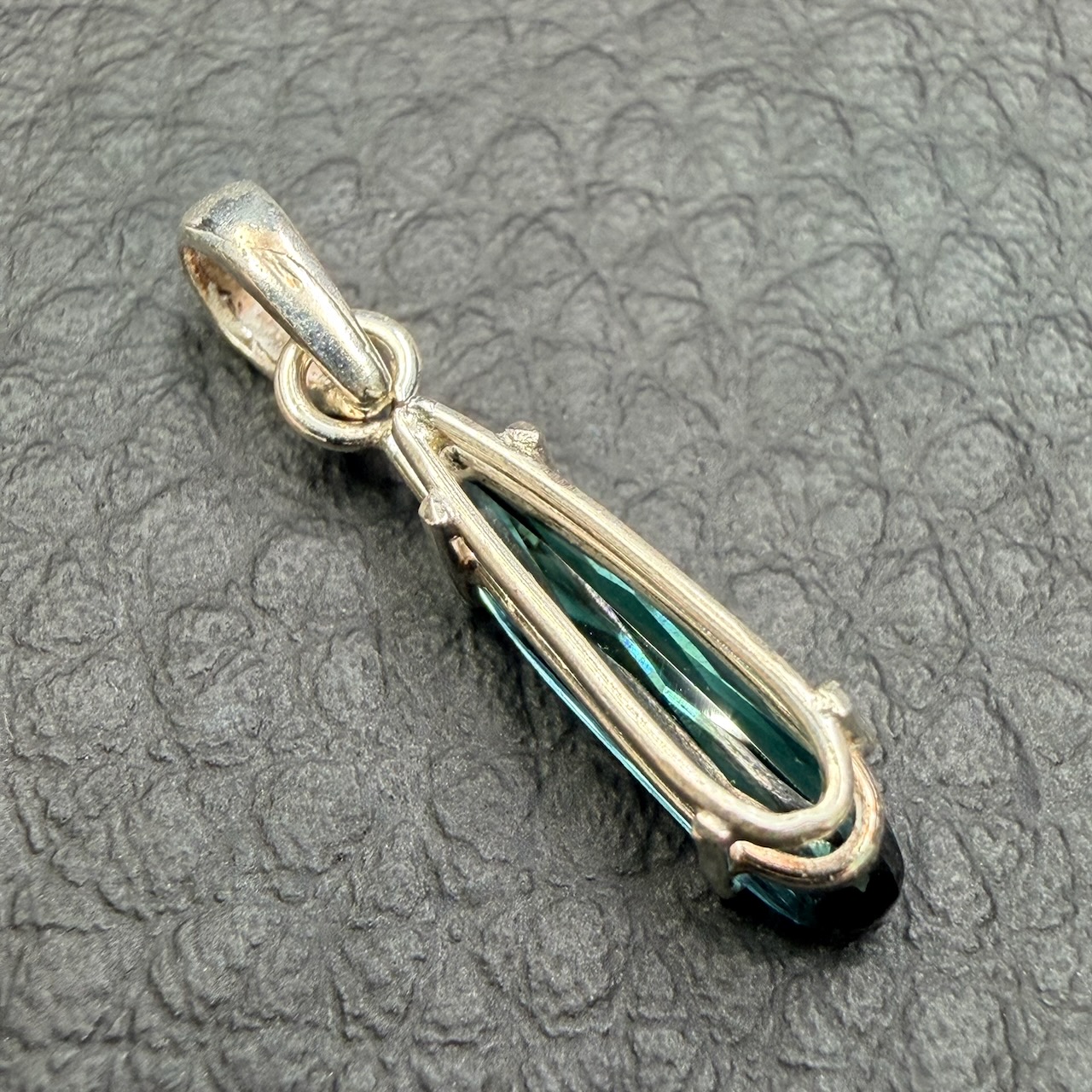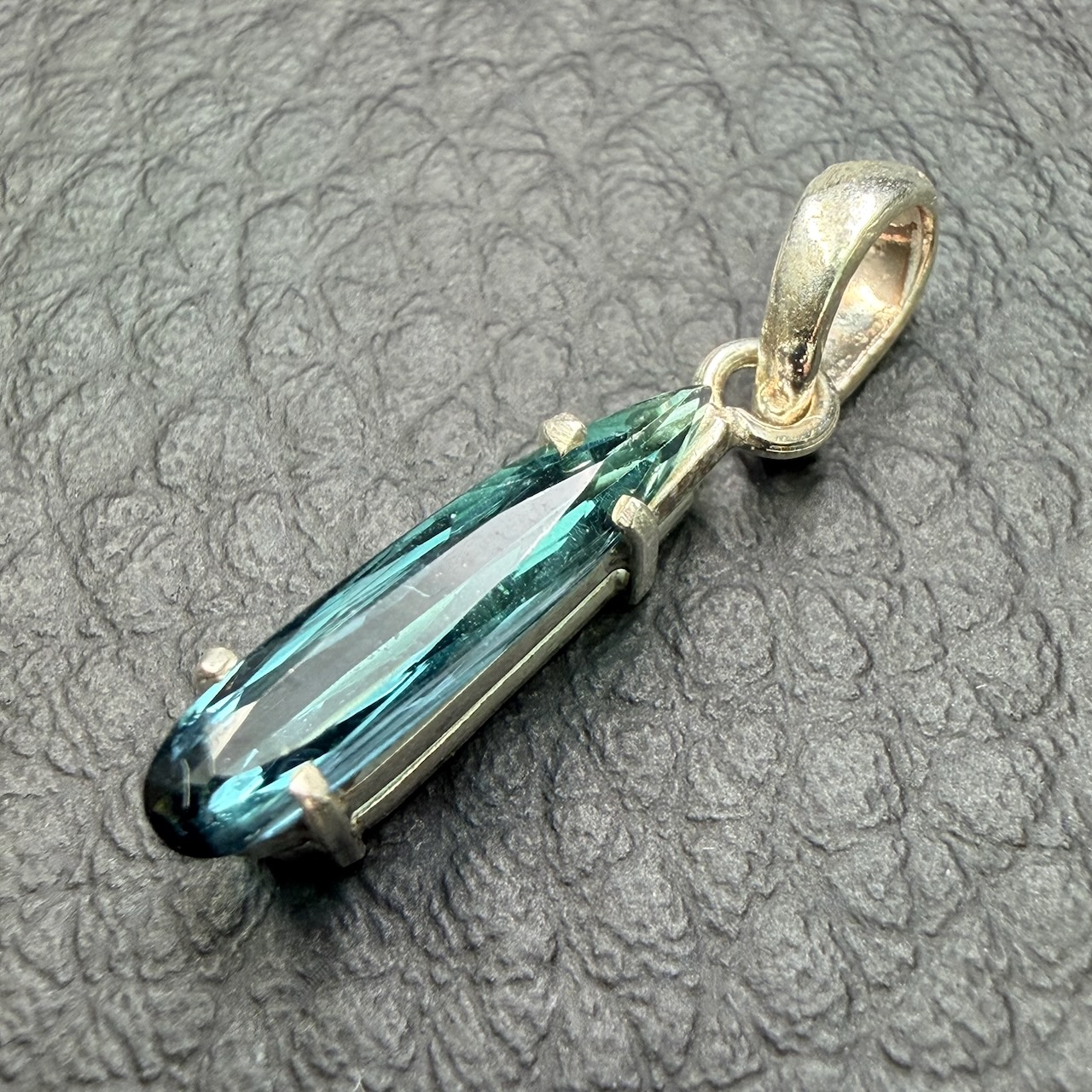 Taille du pendentif tourmaline indicolite hors bélière 1,4 cm sur 0,4 cm sur 0,4 cm.