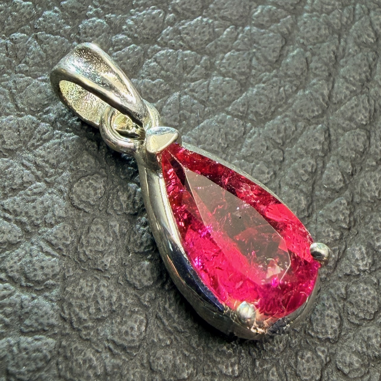 Ce pendentif met en avant une rubellite identifiable par sa couleur, sa structure interne et sa formation. La taille piriforme organise la perception de la pierre, tandis que le sertissage laisse apparaître ses caractéristiques naturelles.