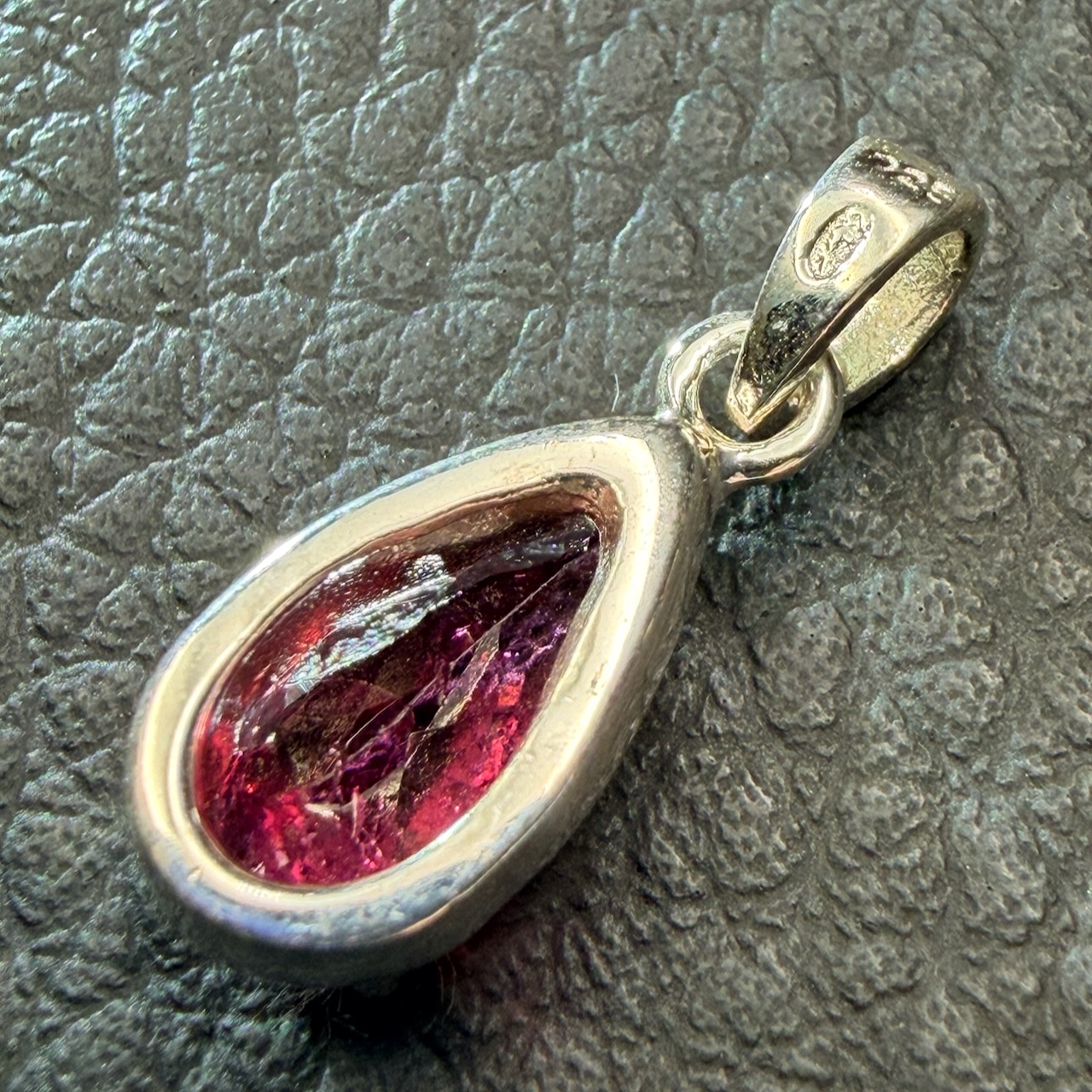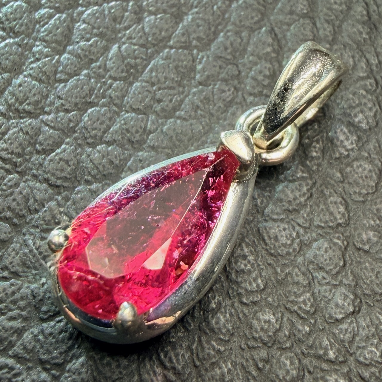 Le Pendentif Tourmaline Rose présenté ici s’appuie sur une pierre dont l’identité ne laisse place à aucune ambiguïté. La rubellite, variété rouge de la famille des tourmalines, se distingue par une coloration franche, souvent irrégulière, qui traduit directement les conditions de sa formation. Contrairement à des gemmes homogènes et calibrées, elle conserve fréquemment des zones internes contrastées, visibles à l’œil nu.