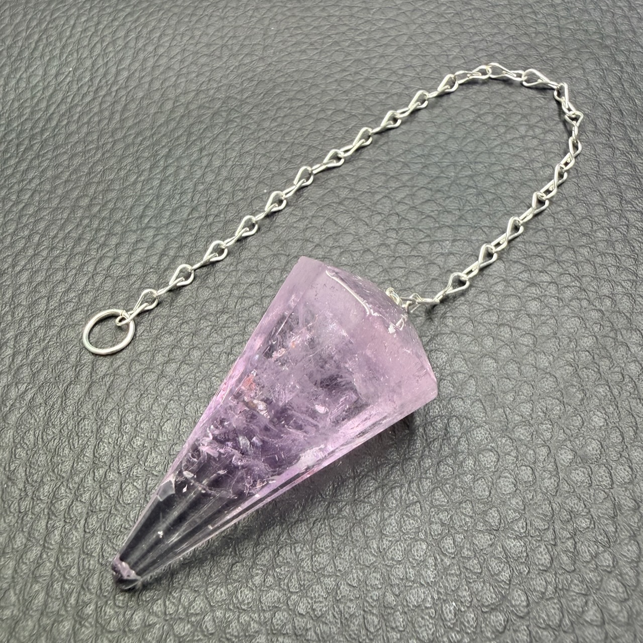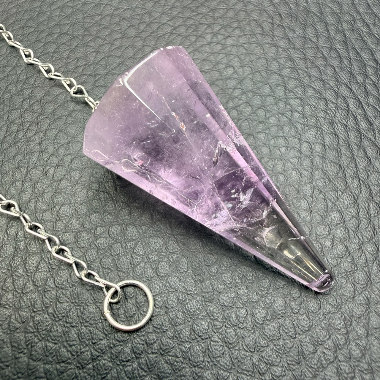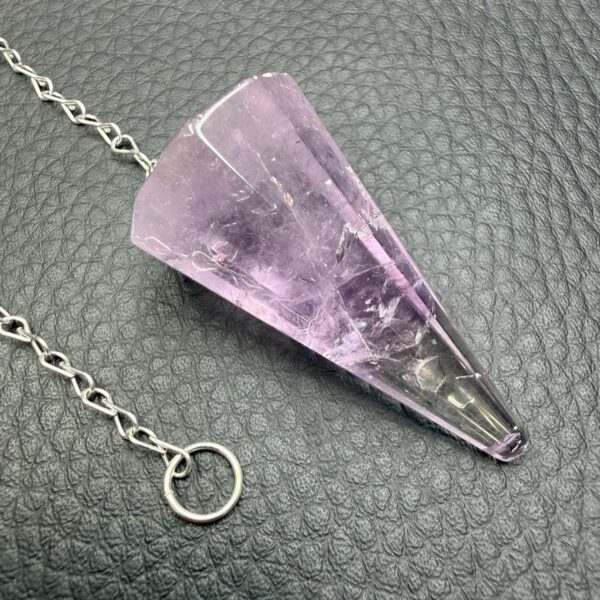 Le pendule en améthyste hexagonal constitue l’un des formats les plus utilisés. Sa géométrie, inspirée de la cristallisation naturelle du quartz, n’est pas uniquement esthétique. Elle influence directement le comportement du pendule lors de son utilisation.