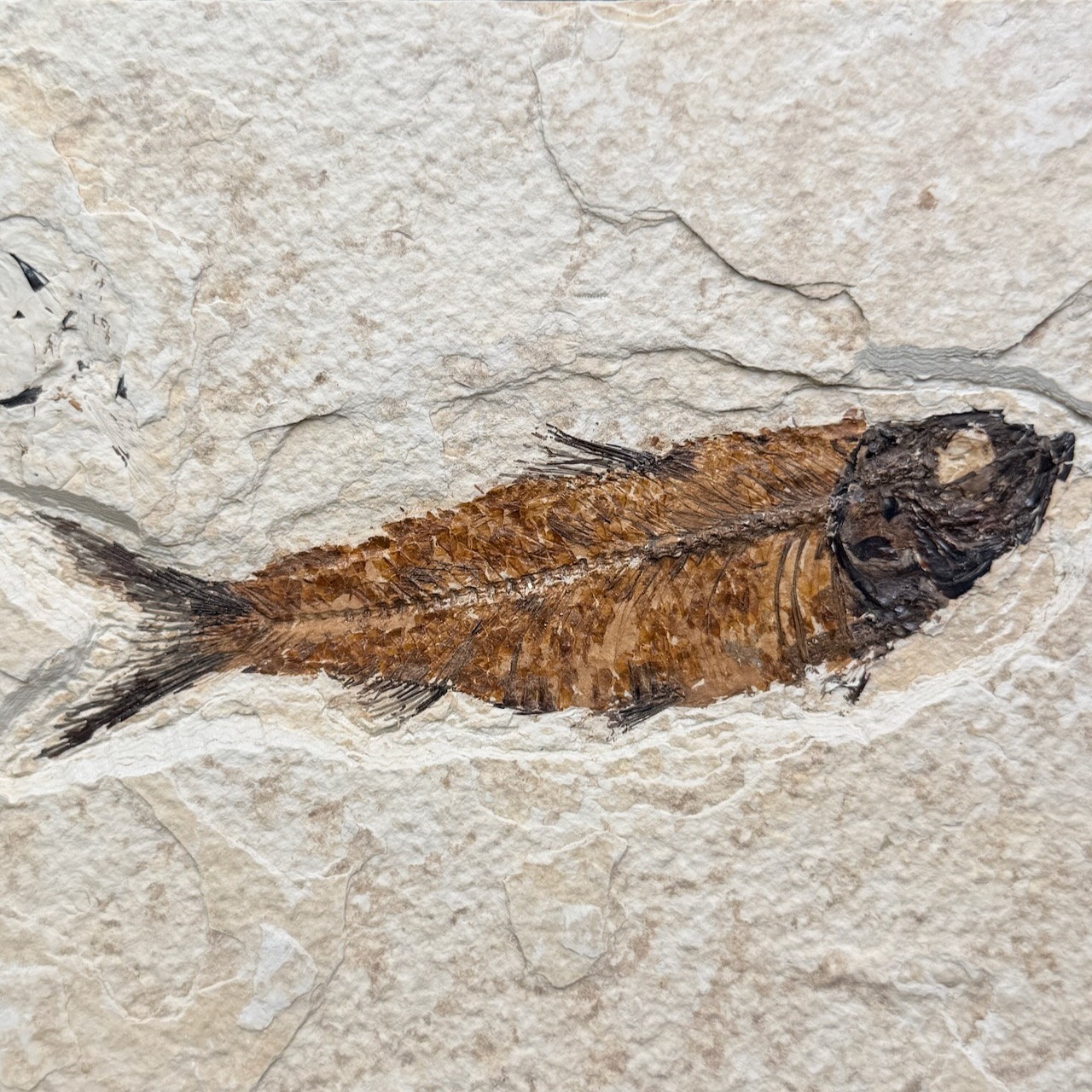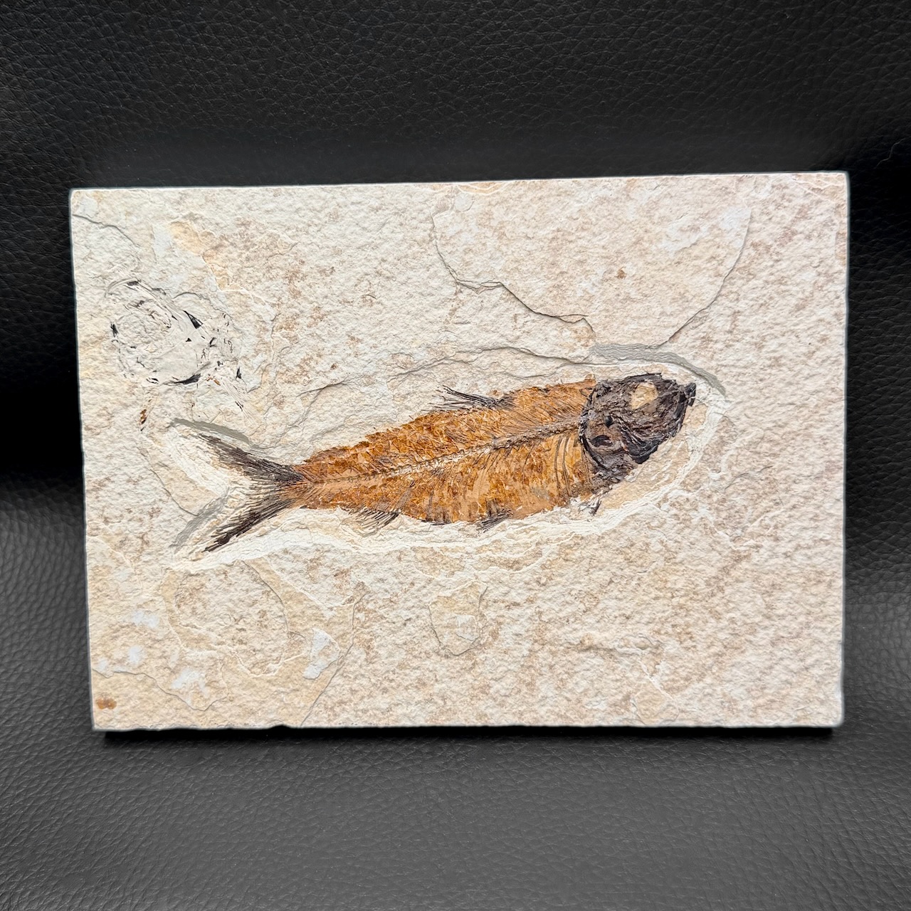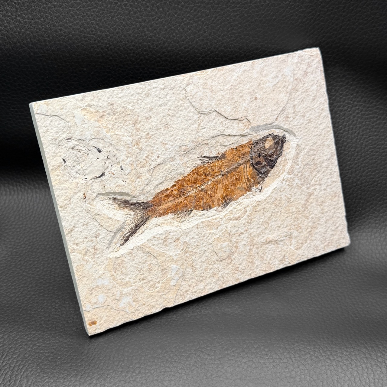 Ce superbe poisson fossile, Knightia, provient de la formation Green River, une formation rocheuse datant de la période Éocène, située dans le Wyoming, aux États-Unis. Knightia, un membre de la famille des harengs, mesurait environ 11 cm de long mais certains spécimens pouvaient atteindre plus de 25 cm.