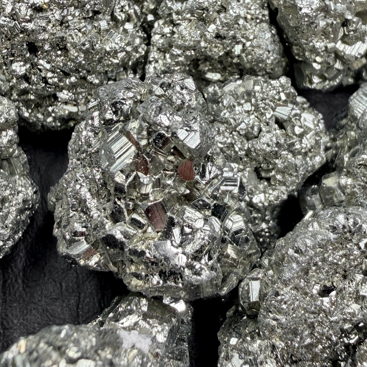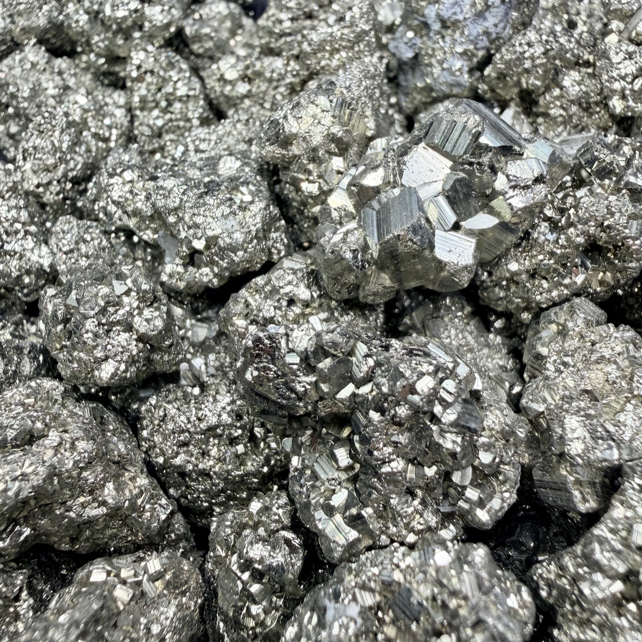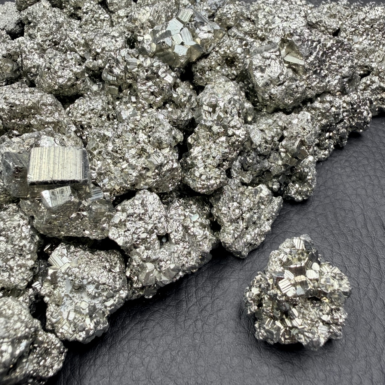 Ses cristaux cubiques, d’une précision presque architecturale, respirent la stabilité et la rigueur minérale. Elle est un sulfure de fer pur, dur, sec, presque inaltérable, et son intensité métallique reste généralement uniforme, fidèle à elle-même au fil du temps.