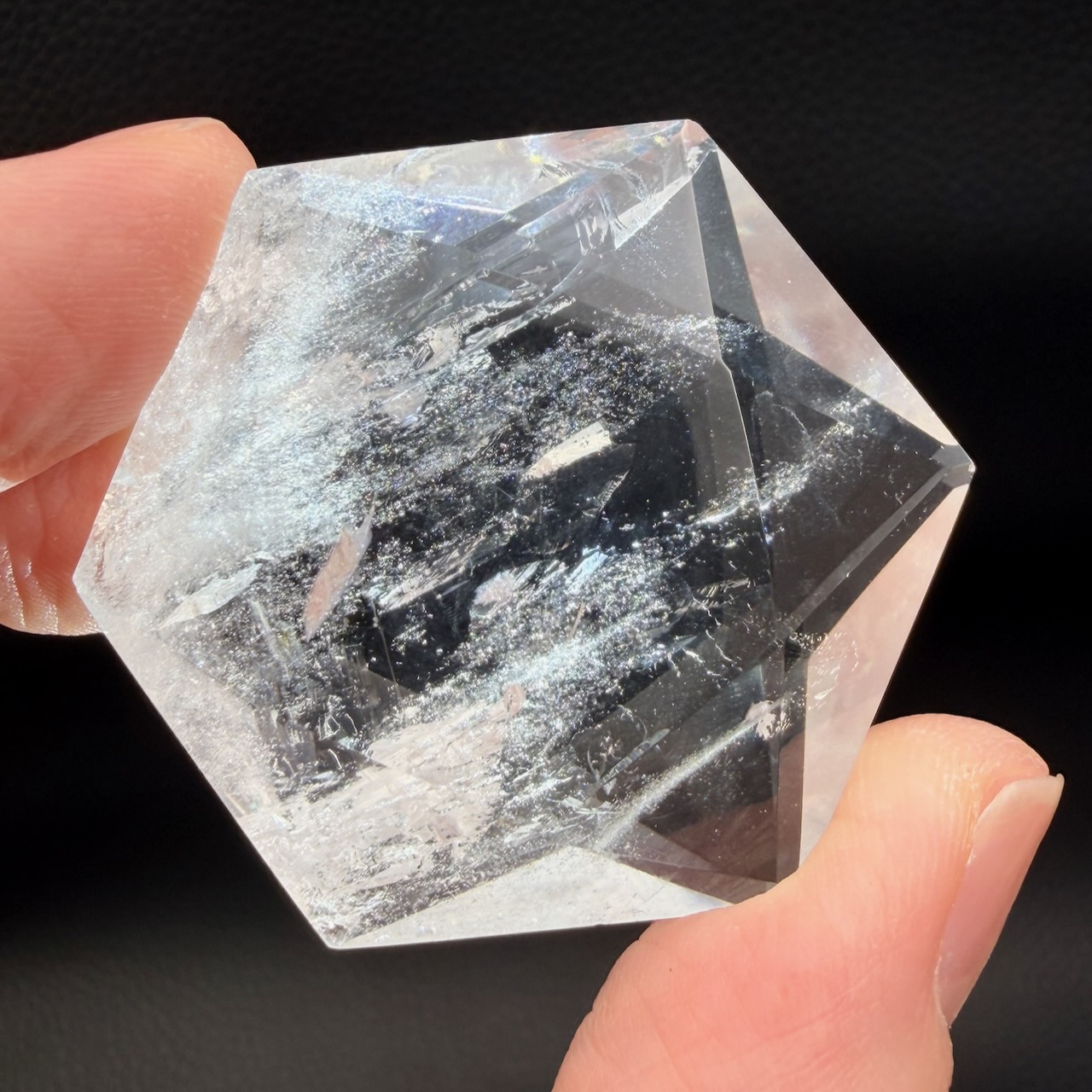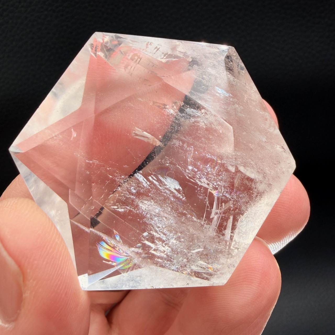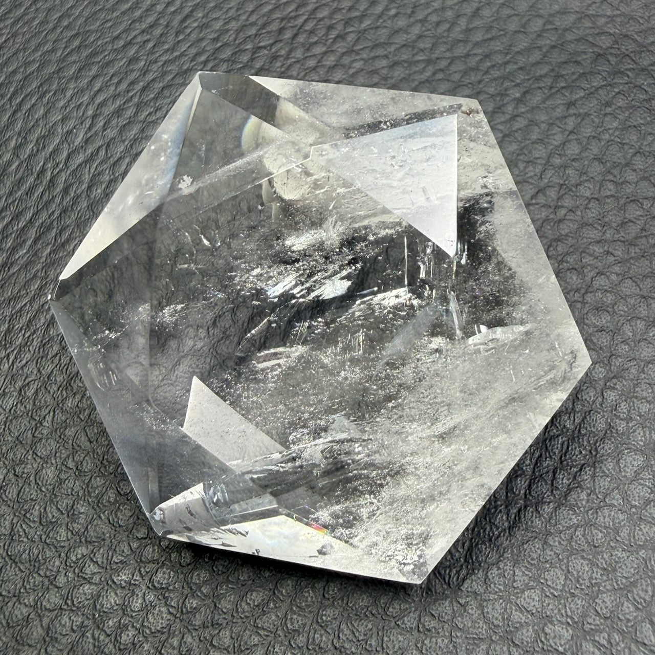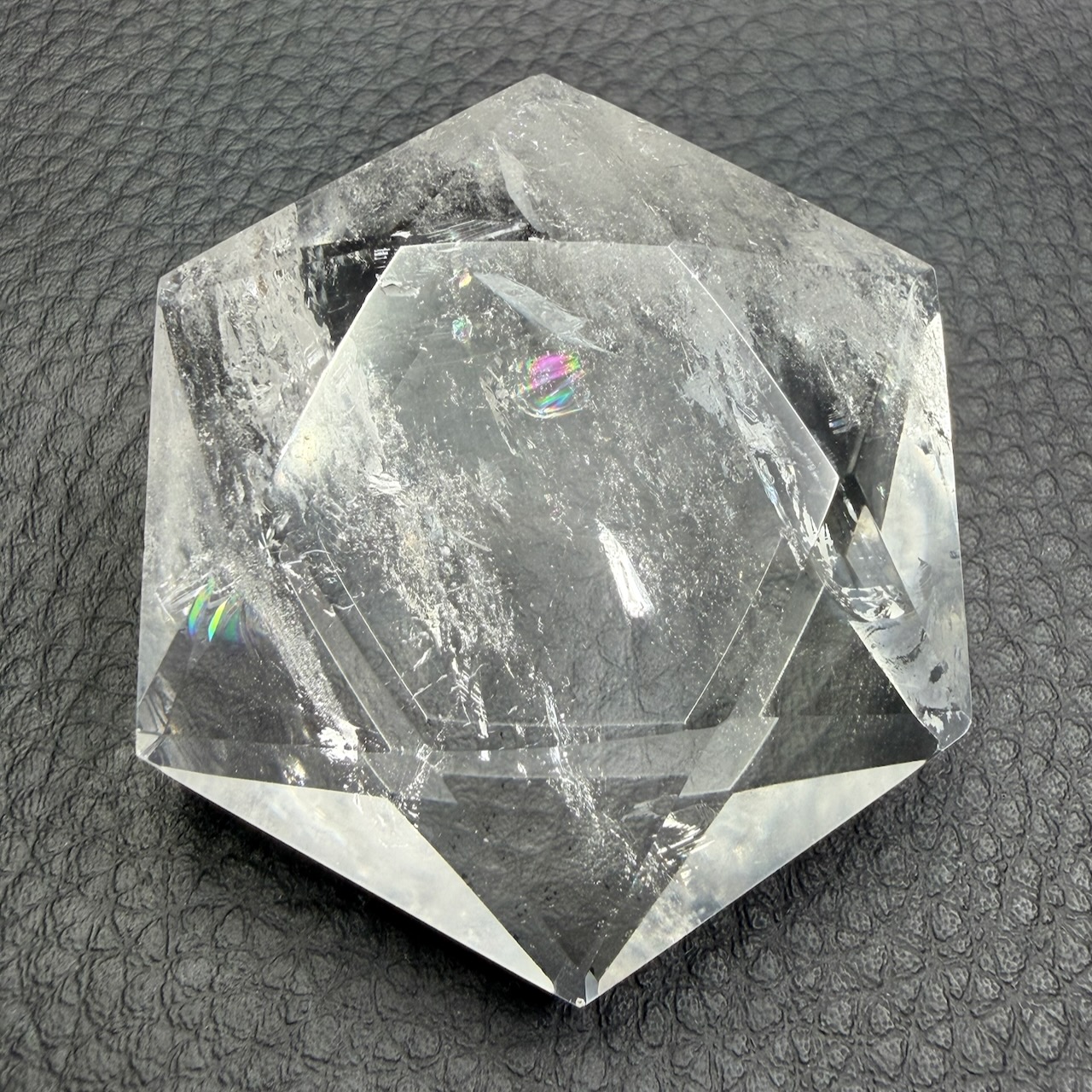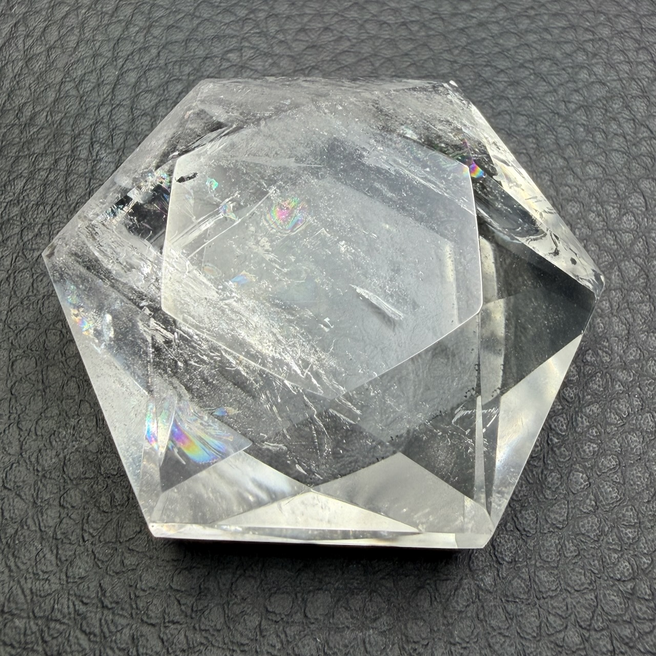 Sa transparence est l’une de ses caractéristiques les plus recherchées. Contrairement à d’autres variétés de quartz colorées, le cristal de roche est dépourvu d’inclusions visibles dans ses formes les plus pures. Cette neutralité visuelle en fait un support adapté à la gravure de symboles précis comme le sceau de Salomon.