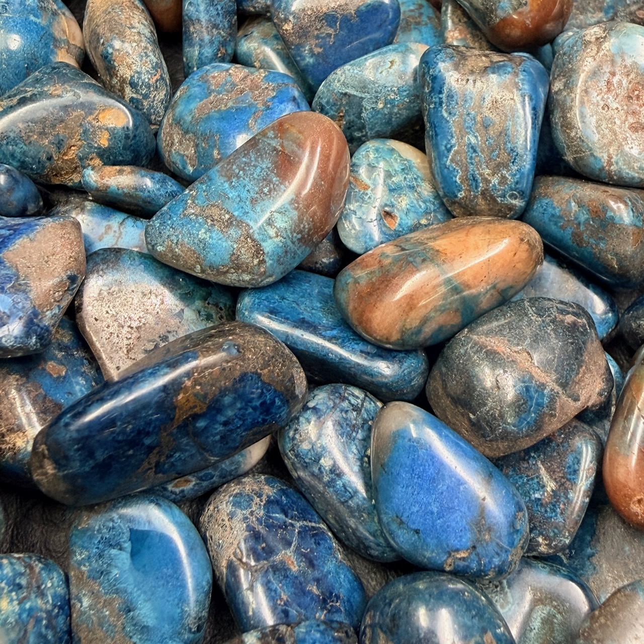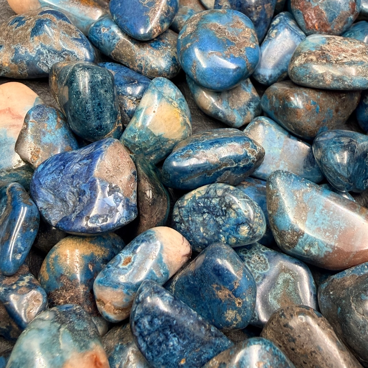 Chaque pierre roulée reste unique, car elle conserve les caractéristiques propres au fragment d’origine. Les nuances de bleu, les veines minérales ou les inclusions témoignent de l’histoire géologique particulière de chaque échantillon.