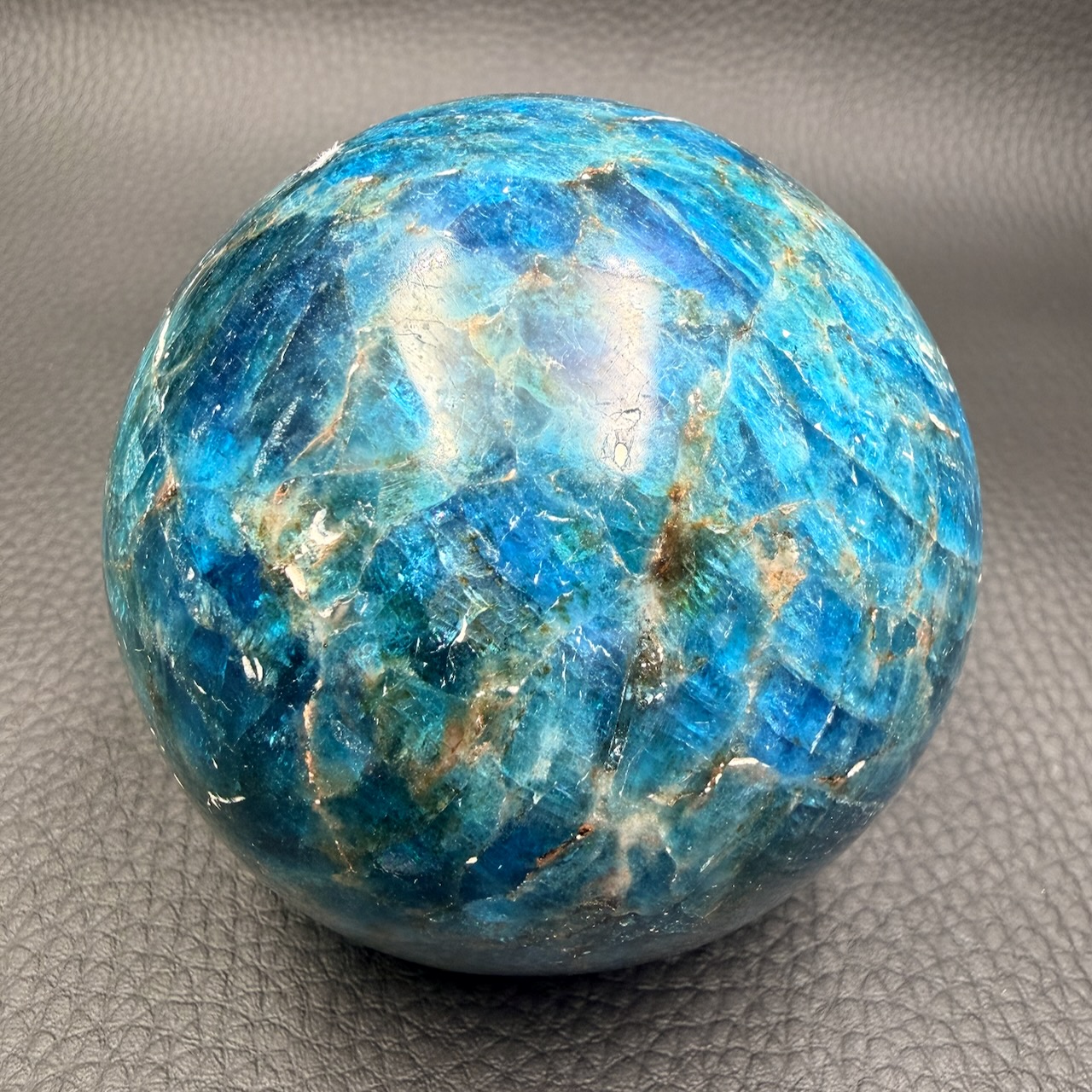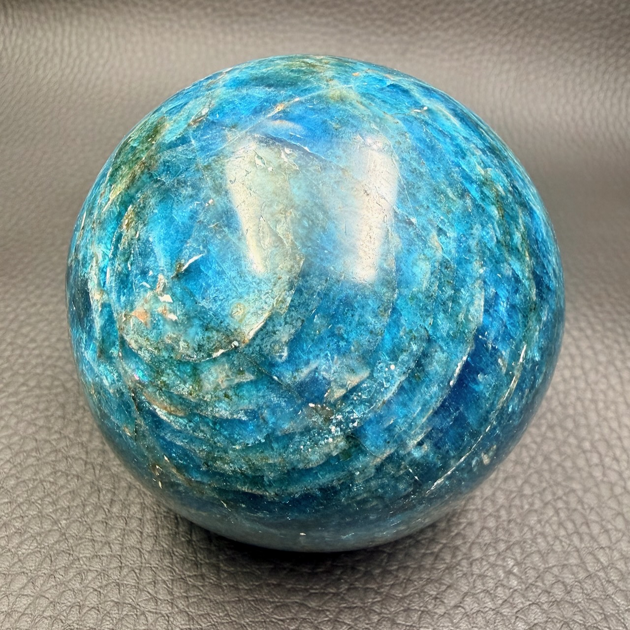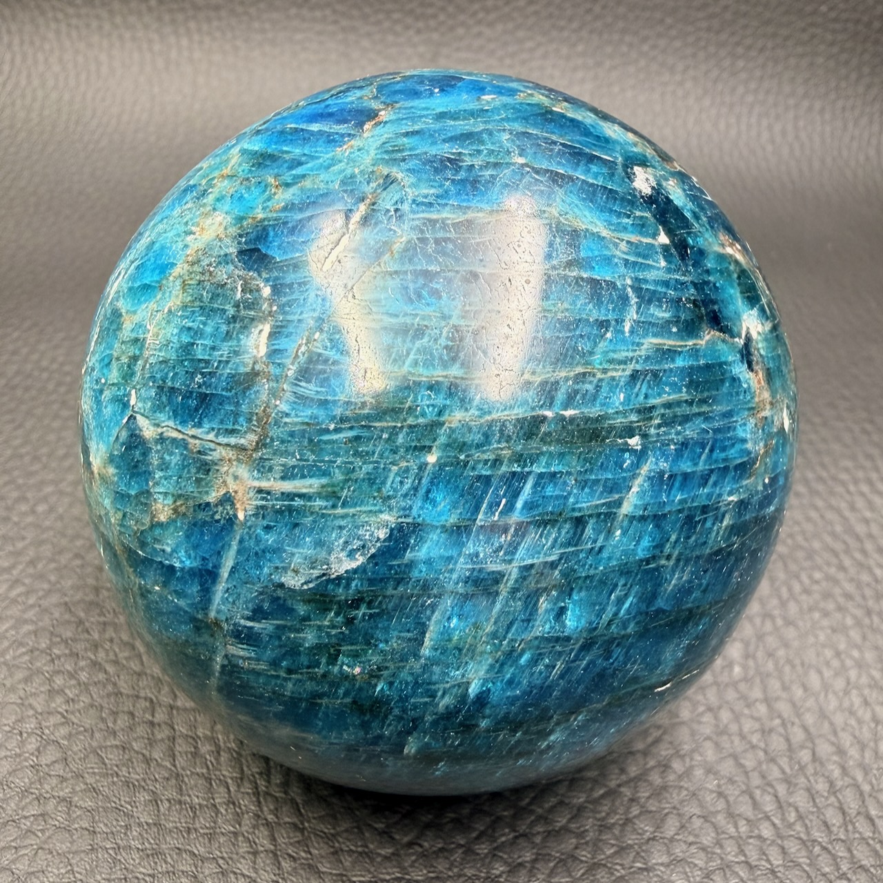 Diamètre de la sphère en apatite bleue 7,5 cm approximatif.