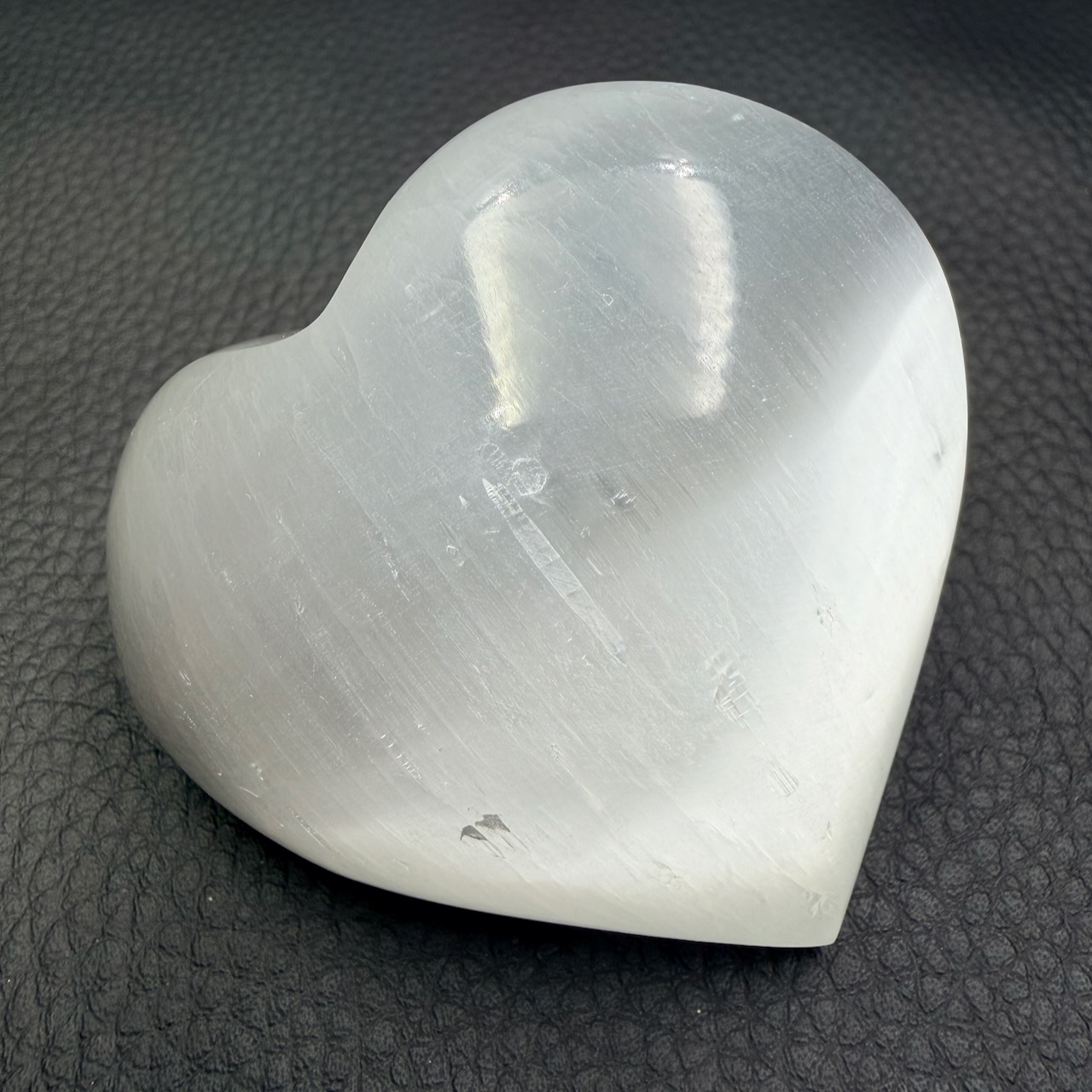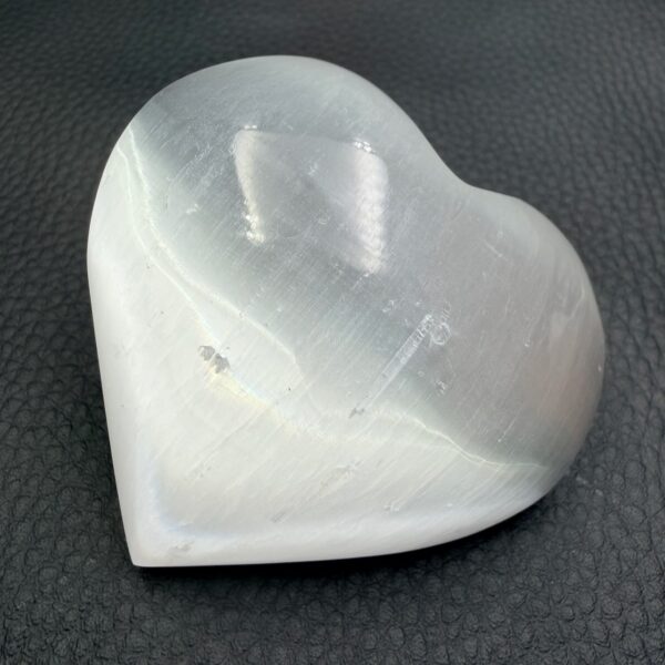 Les cristaux s’organisent en longs filaments parallèles, permettant à la lumière de circuler à travers la pierre par un phénomène proche de la fibre optique naturelle. Cet effet visuel spectaculaire est à l’origine de la chatoyance, également appelée effet « œil-de-chat ». Sous l’éclairage, le coeur en sélénite semble alors animé, presque vivant, diffusant une lueur douce et mouvante.
