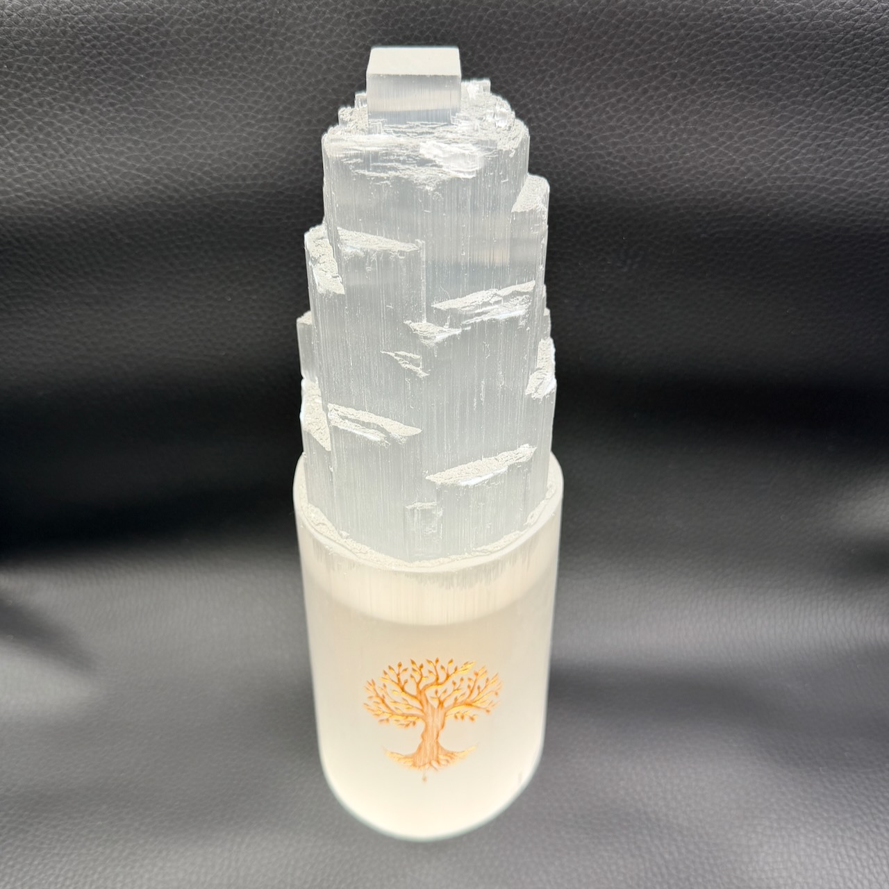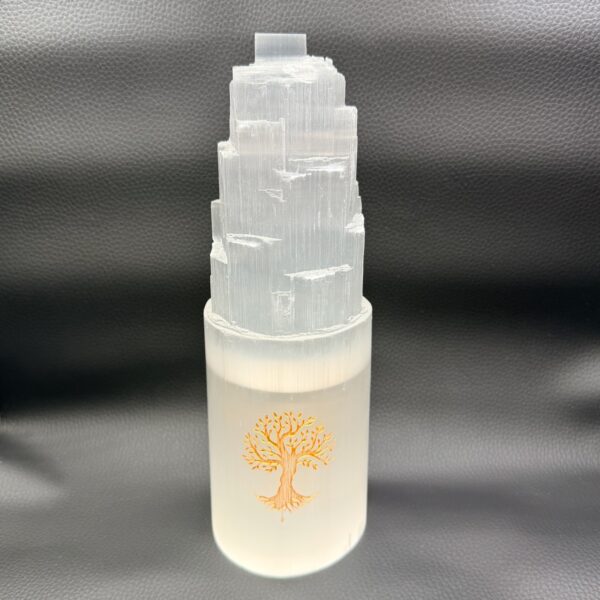 L’Arbre de Vie représente l’interconnexion entre tous les niveaux de l’existence. Ses racines s’enfoncent profondément dans la base de la sélénite, symbolisant notre ancrage, notre force intérieure et notre lien avec la Terre-Mère. Son tronc, solide et droit, incarne le présent, notre passage sur cette terre et notre stabilité émotionnelle.