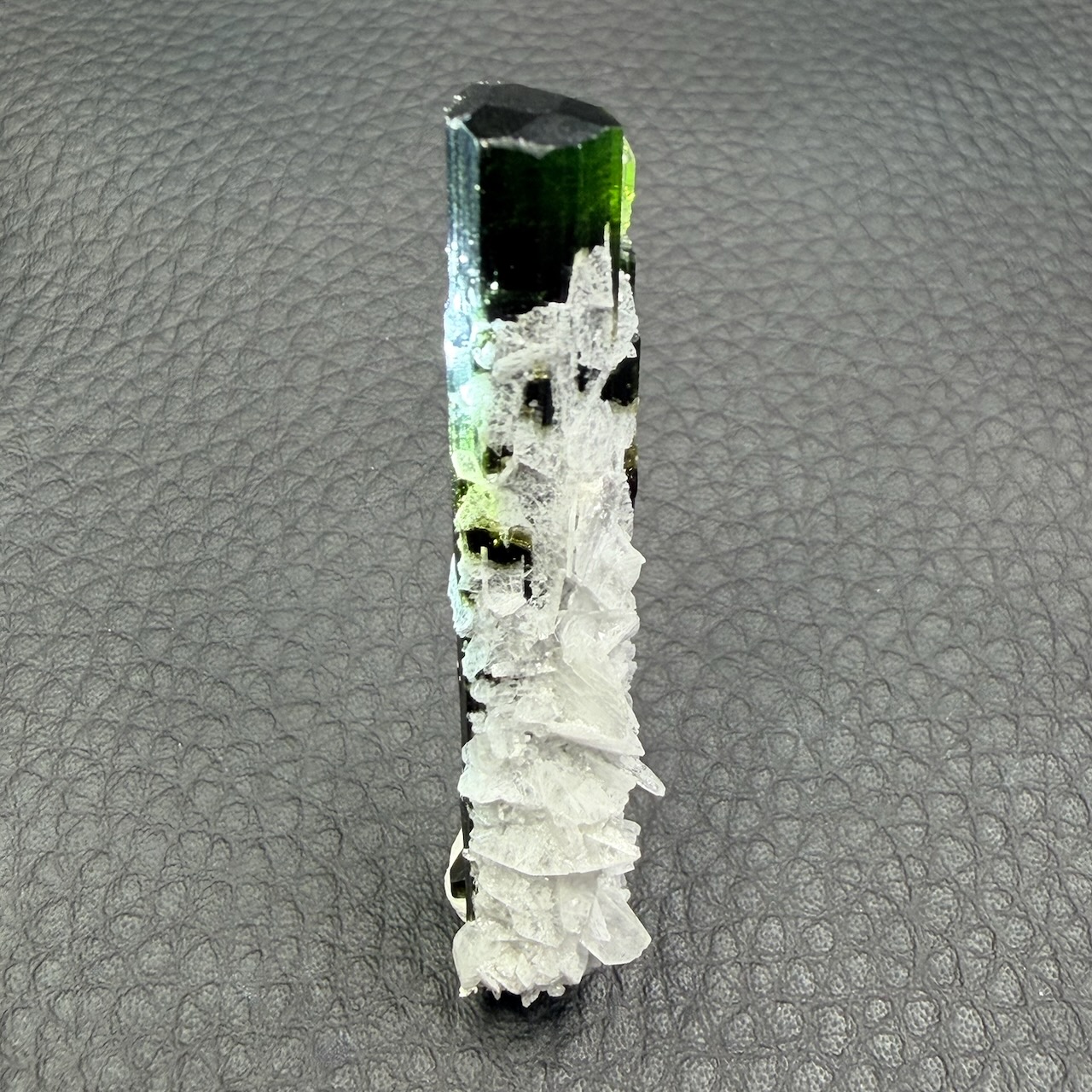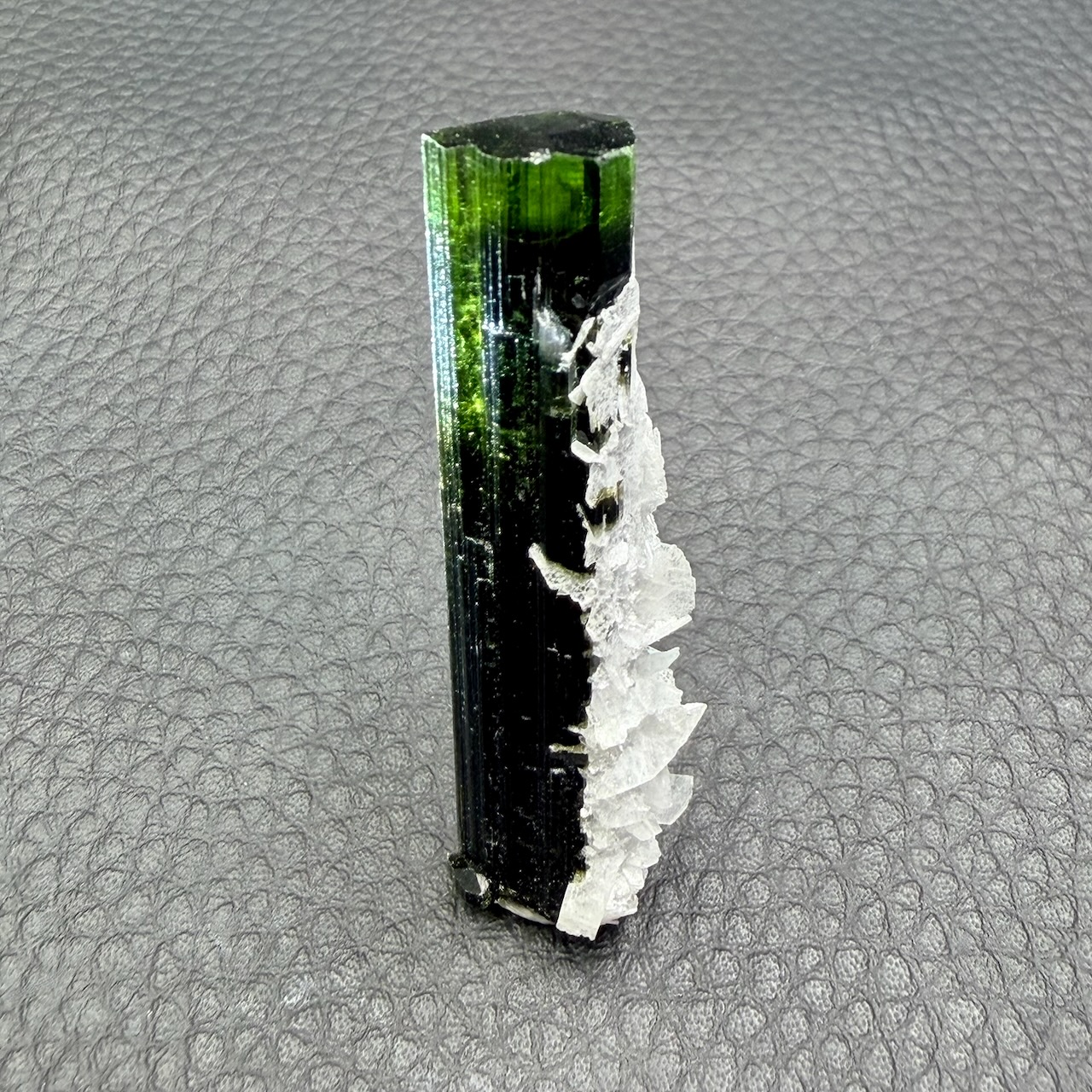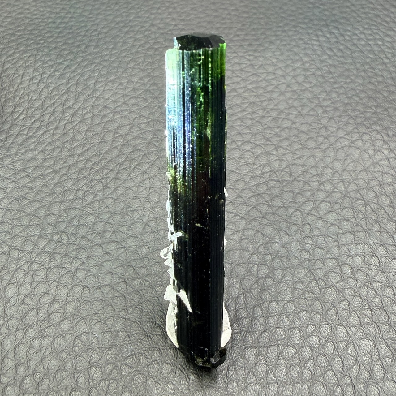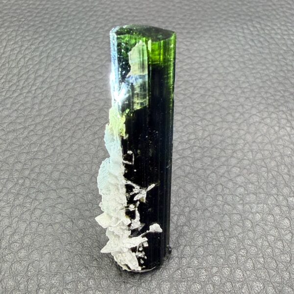 Couleur : La couleur verte de la tourmaline est principalement due à la présence de fer et parfois de chrome ou de vanadium. La teinte peut varier du vert clair, presque pastel, au vert foncé intense. Certains spécimens peuvent même présenter des teintes changeantes en fonction de la lumière, ce qui renforce leur attrait.