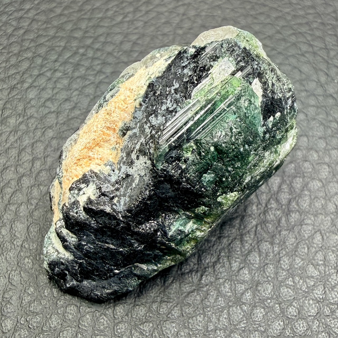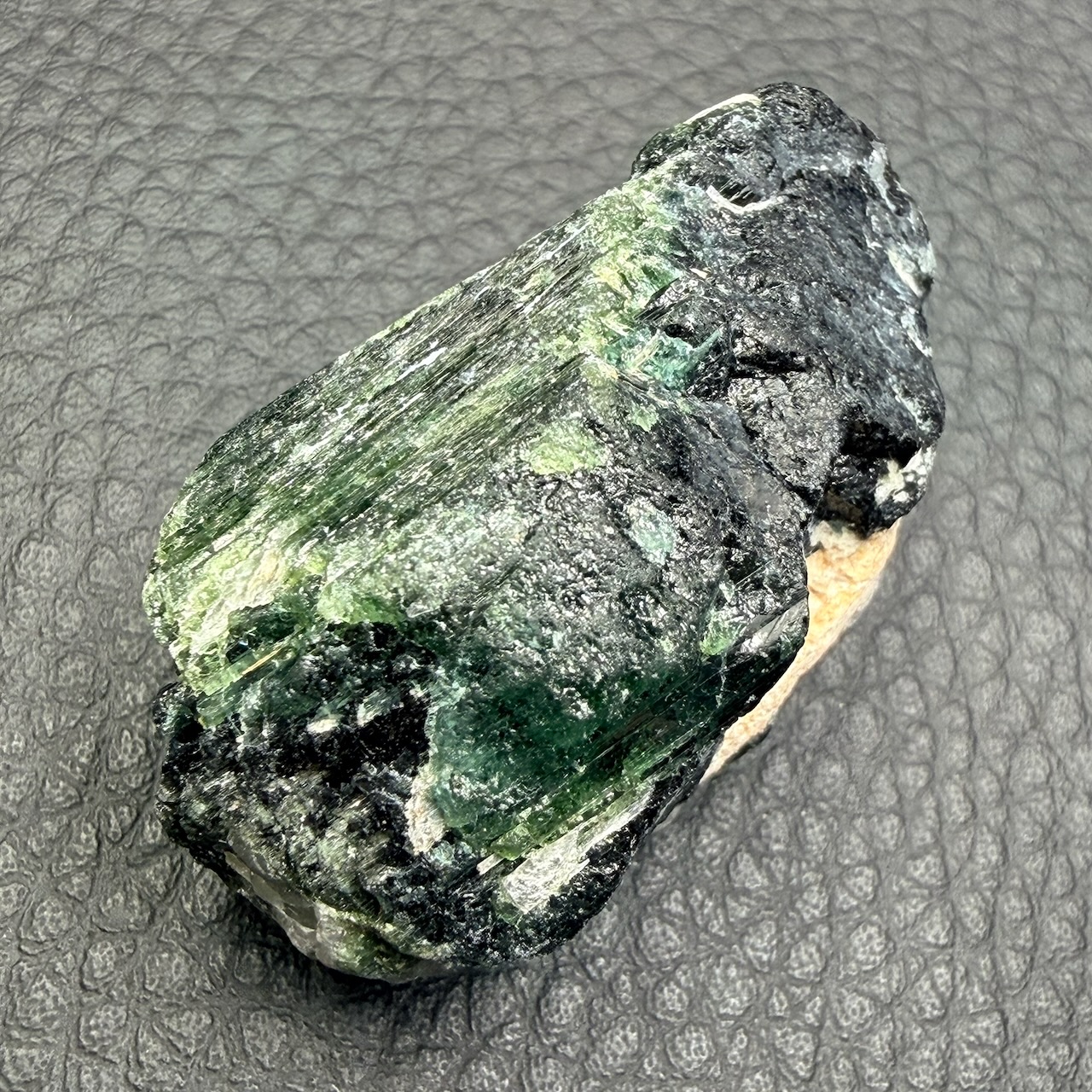 Couleur : La couleur verte de la tourmaline est principalement due à la présence de fer et parfois de chrome ou de vanadium. La teinte peut varier du vert clair, presque pastel, au vert foncé intense. Certains spécimens peuvent même présenter des teintes changeantes en fonction de la lumière, ce qui renforce leur attrait.