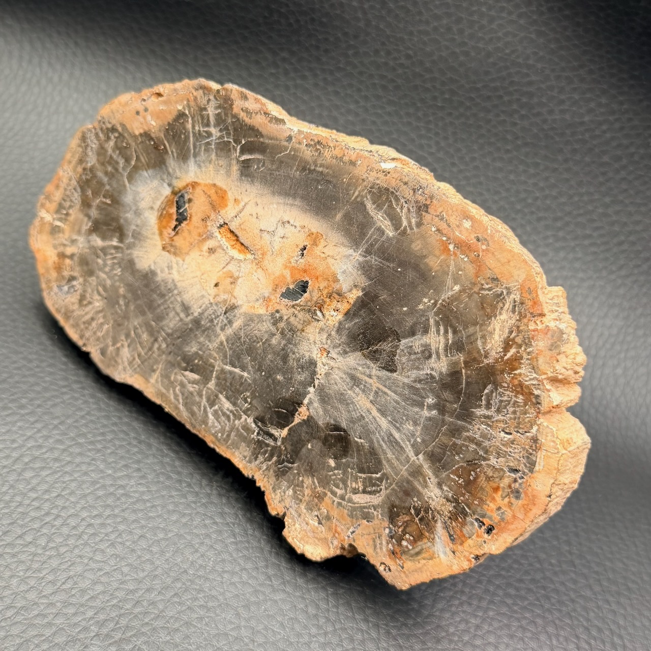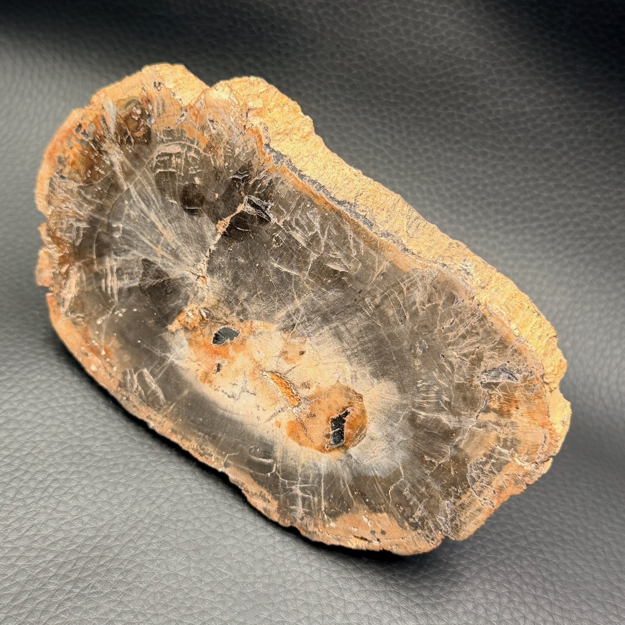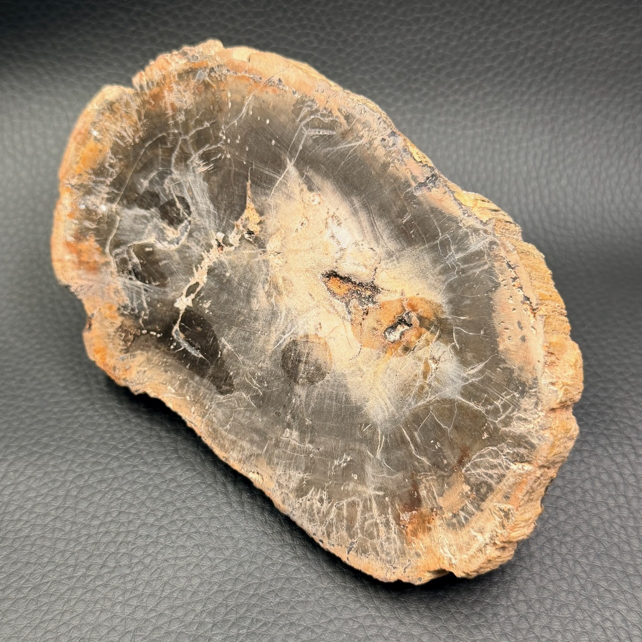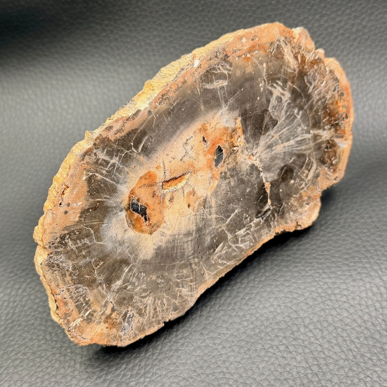 La tranche de bois fossile est une pierre d’ancrage qui invite à ralentir et à prendre le temps.