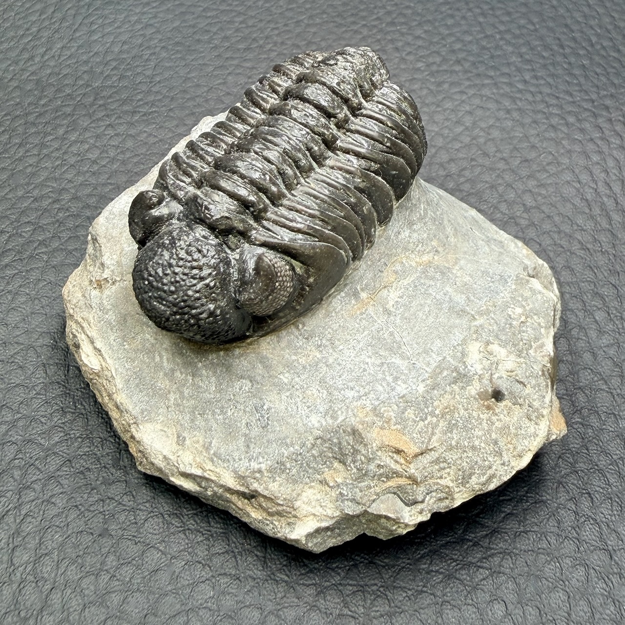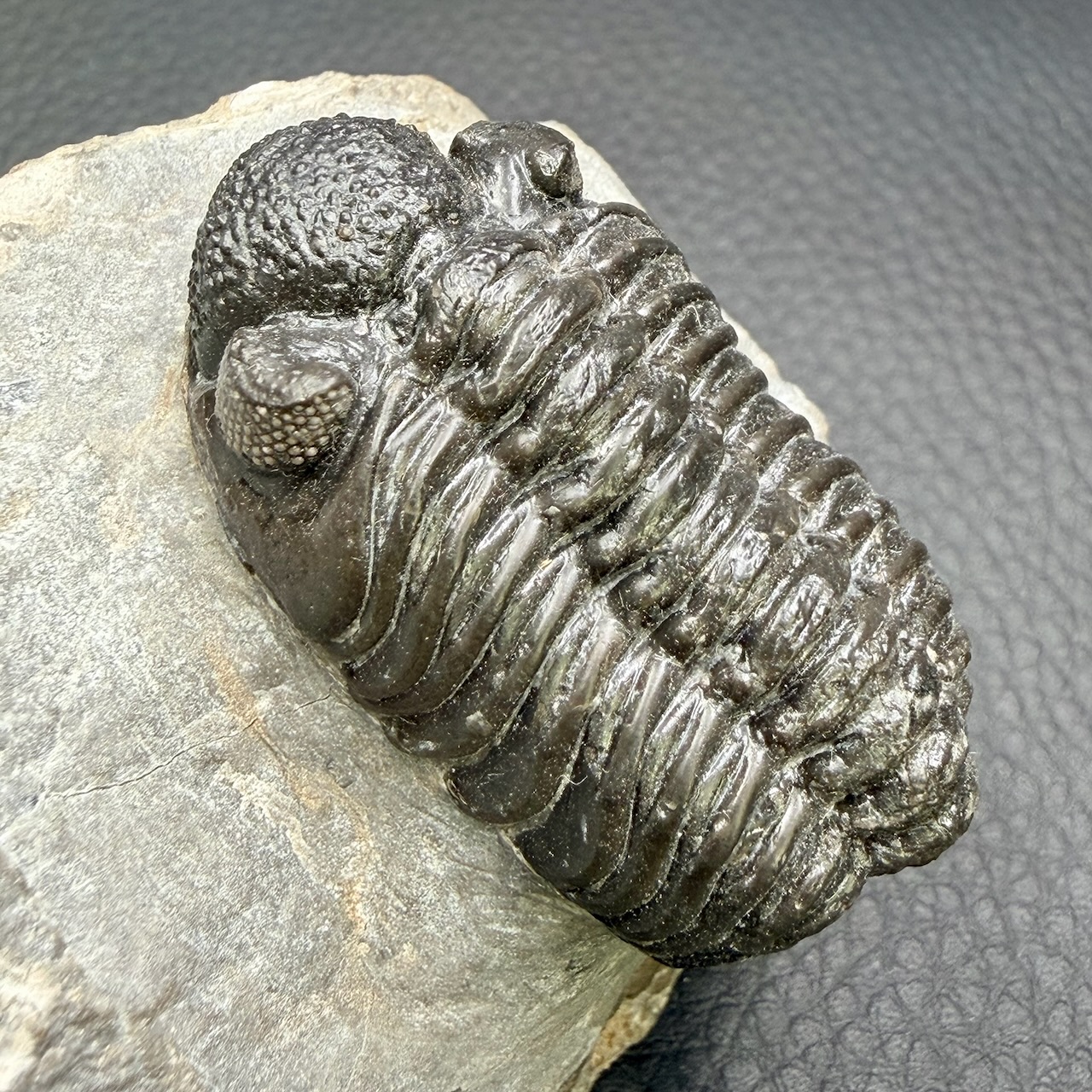 L’une des particularités les plus frappantes du Phacops est ses yeux composés de type schizochroal, qui sont très différents des yeux des autres trilobites. Chaque œil est constitué de grandes lentilles individuelles séparées par des sclères calcifiées. Ce type de structure oculaire lui offrait une excellente vision panoramique, idéale pour repérer les prédateurs et ses proies dans les environnements marins complexes. Cette vision était un atout important pour la survie du trilobite dans les océans du Dévonien.